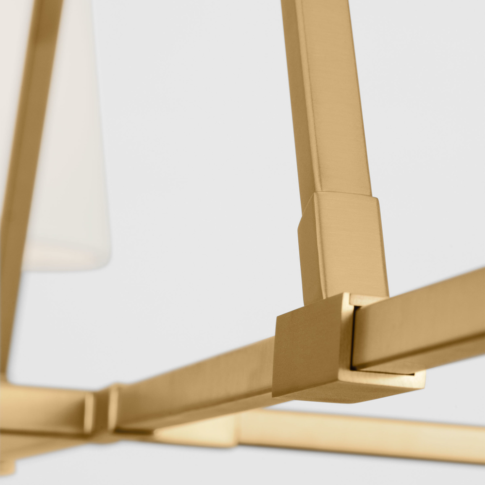 The Perth Collection is a modern and angular take on a traditional trestle form - often seen in furniture and bridges. The arms of the chandeliers are suspended from a triangular frame which both adds strength and a distinctive overall profile. Each item is made from square tubing accented with bracket details where the arms and supports intersect.