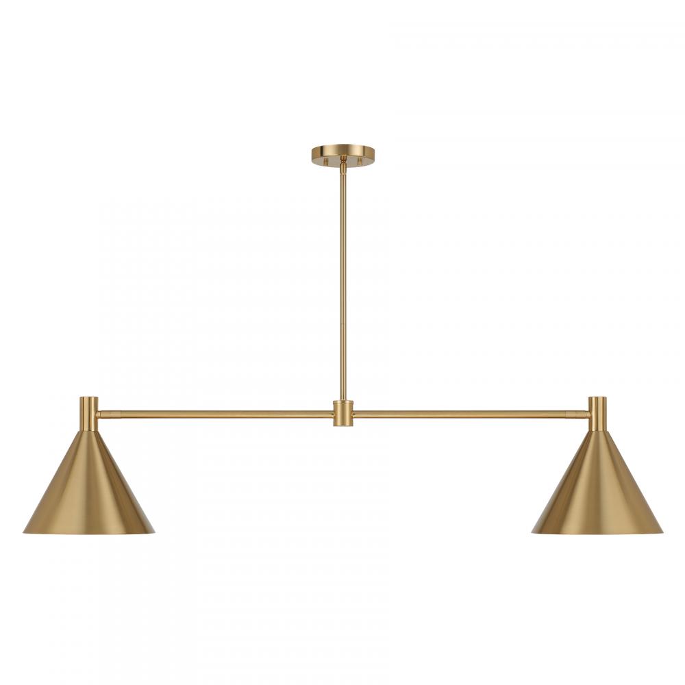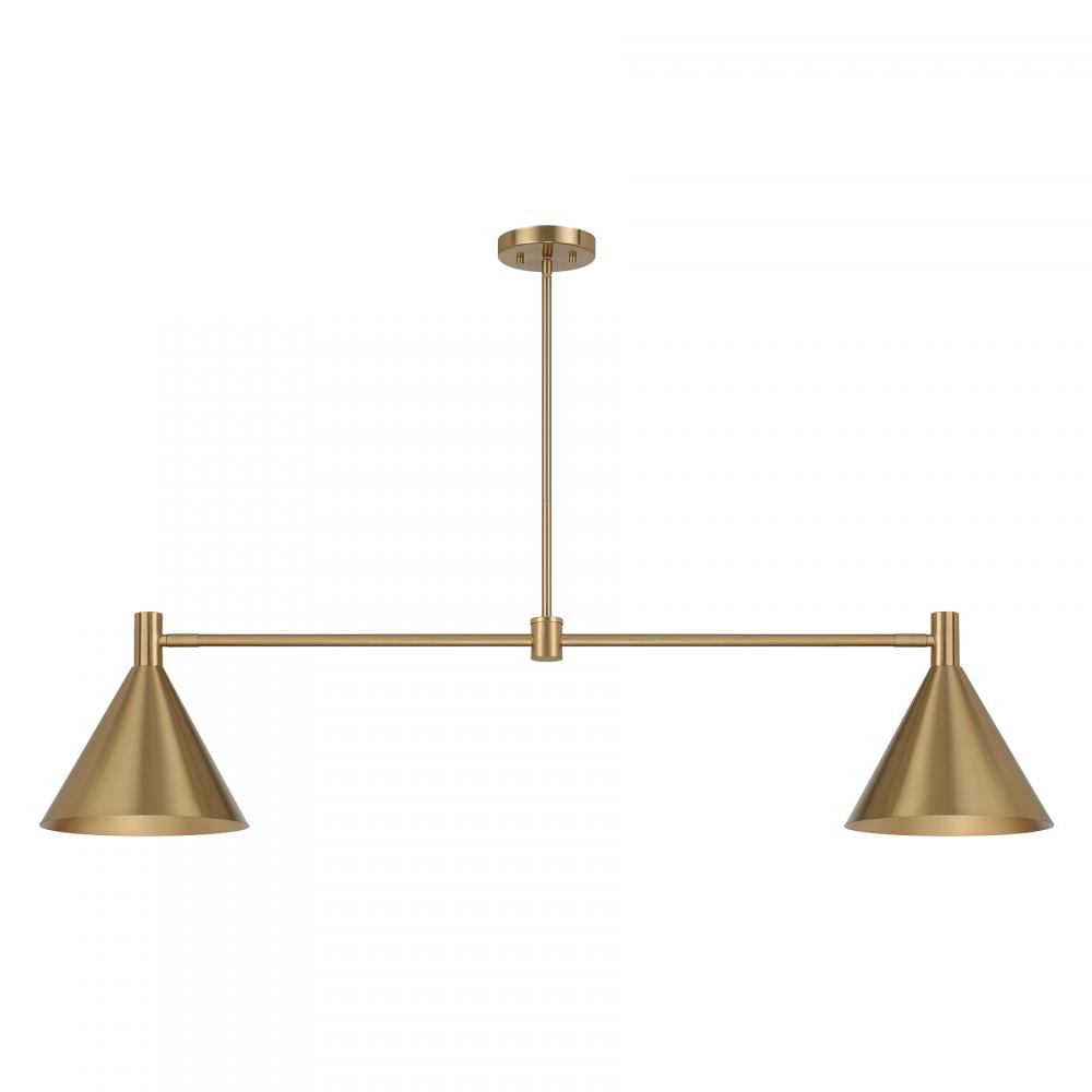 The Savoy House Pharos 2-light linear chandelier is part of Moderne by Breegan Jane, bringing her signature approachable modern luxury style to your home. Breegan loves how metallics elevate a design, as exemplified by the opaque metal shades finished entirely in champagne-toned Noble Brass. The shades can be adjusted, providing different angles of light to meet your needs. Pharos is 50" in length, 10" in width and has an adjustable height ranging from 11" to 65". Comes with four 12" downrods and one 6" downrod. Uses two candelabra size bulbs of up to 60 watts per bulb. Bulbs not included.