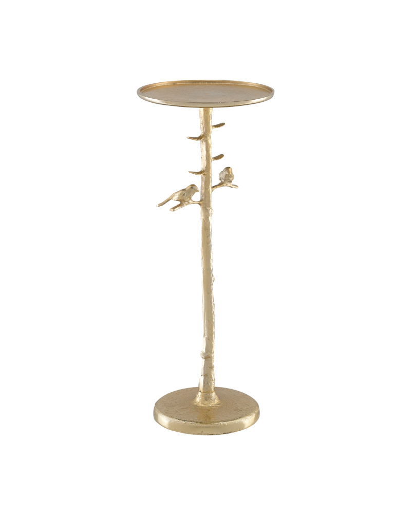 The Piaf Gold Drinks Table is a cast aluminum accent table in a luminous gold finish that will make it gleam from its spot in a room. The whimsical design has two birds perched on twigs extending from a branch-like stem that holds its top.