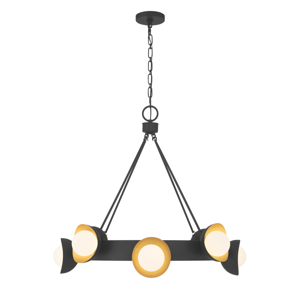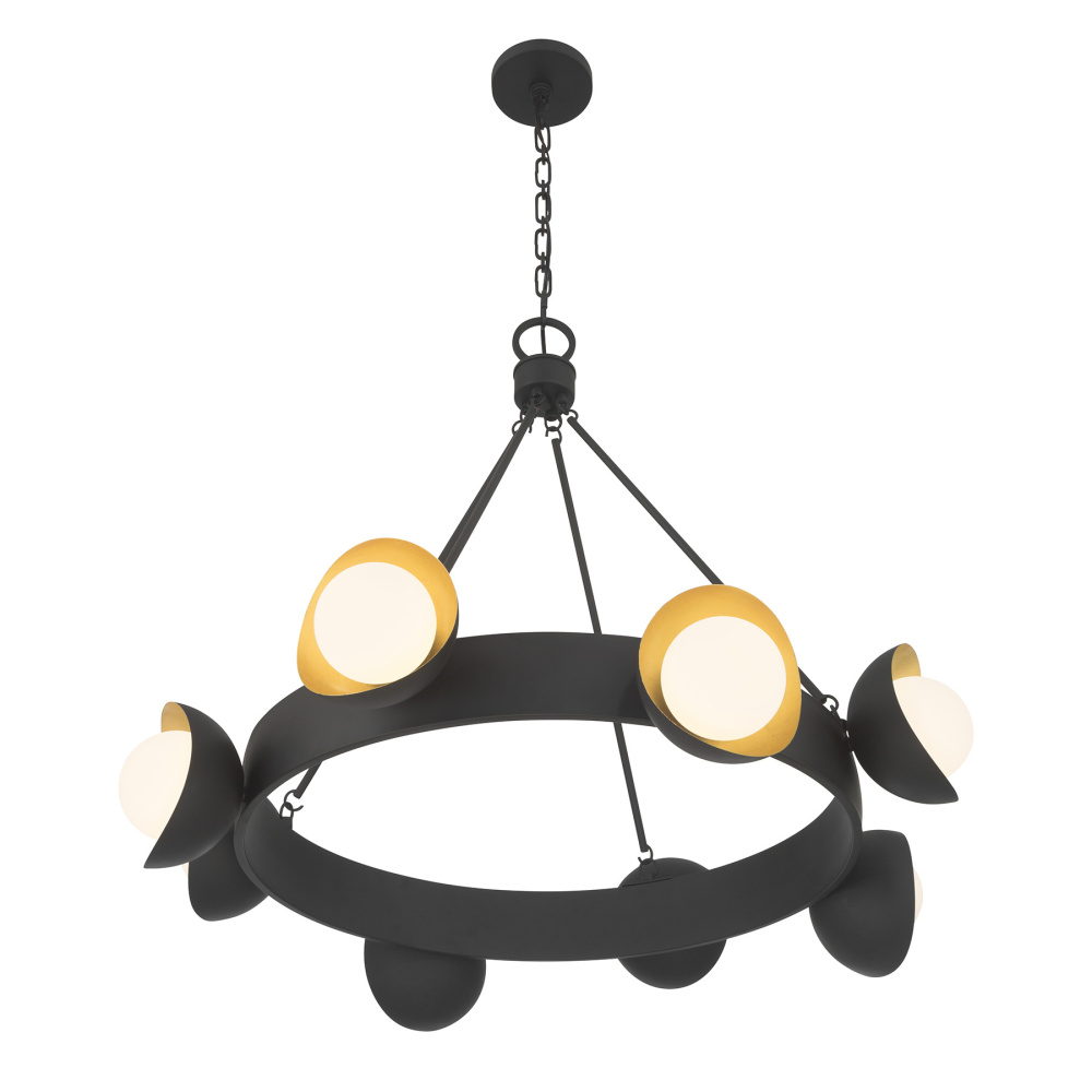 The Savoy House Pierson 8-light chandelier brings scene-setting drama to any space. Its open wagon-wheel silhouette features sculptural hoods that cradle orbs of white opal glass, pairing a Black Cashmere exterior with a True Gold interior for a radiant two-tone glow. Pierson is 29.38" in height and 33" in width. It uses eight G9 bulbs of up to 60 watts per bulb. Bulbs not included. Comes with 120" of chain.