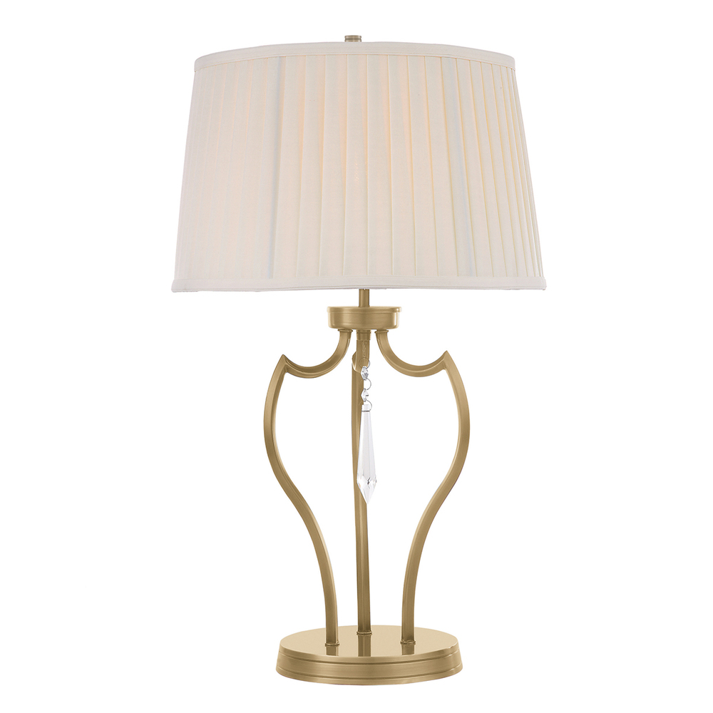 The Pimlico Family of products are beautifully crafted using fine square tubing dramatically curved on its edge. This table lamp includes an elegant crystal droplet to accent the aged brass finish. The table lamp is finished with a traditionally pleated creamy white shade that has a 14" diameter at its widest point. This table lamp is 24" in height.