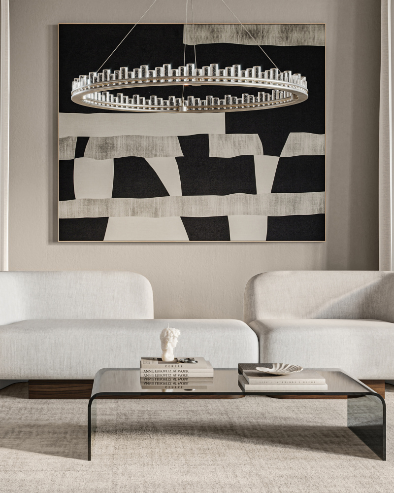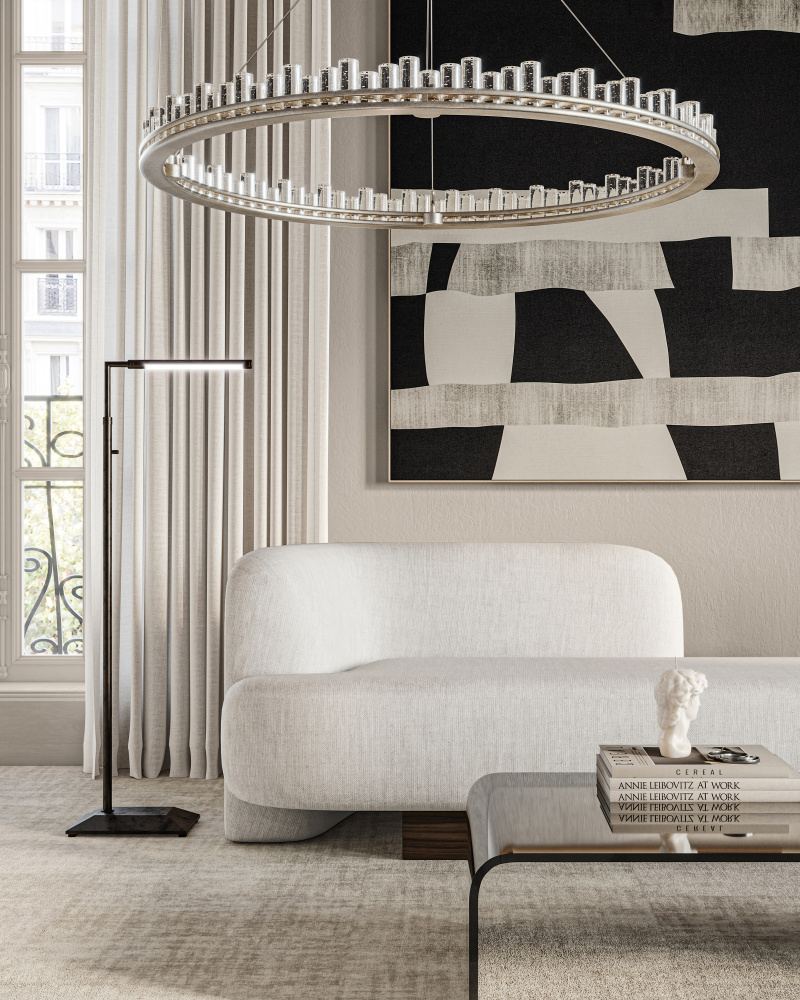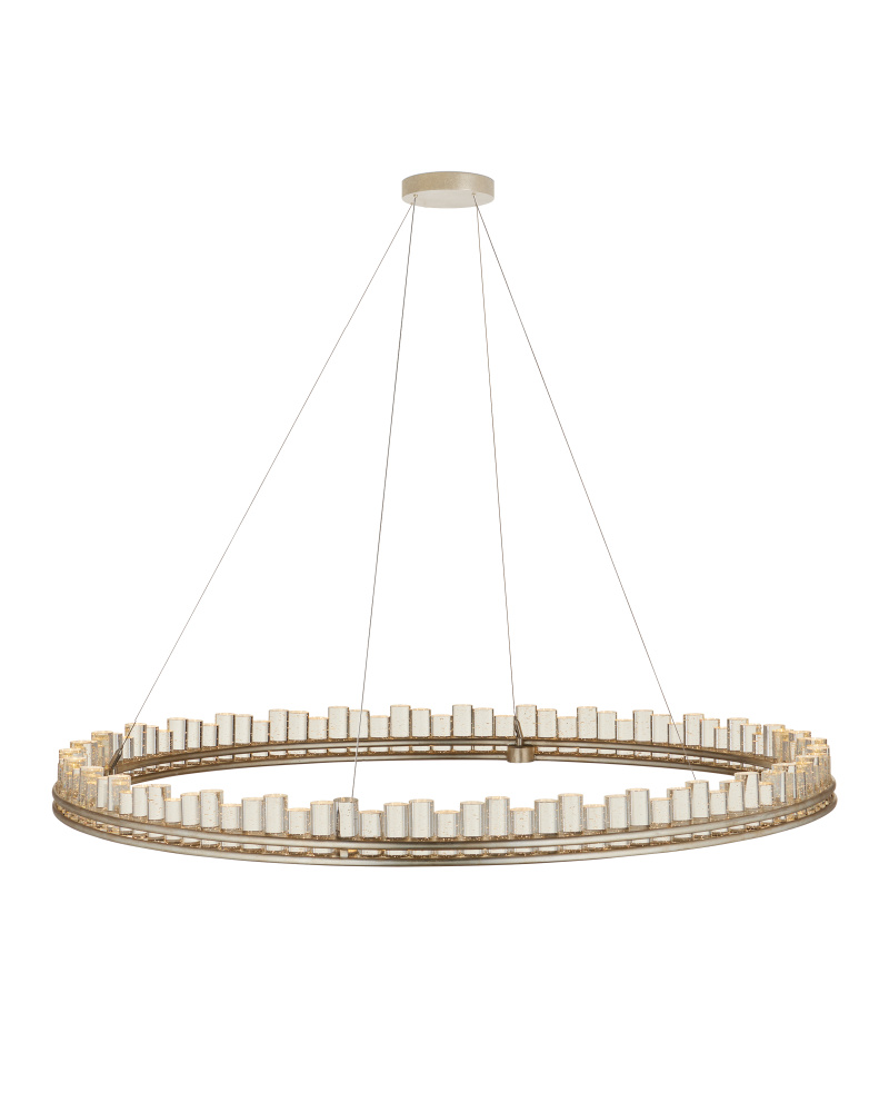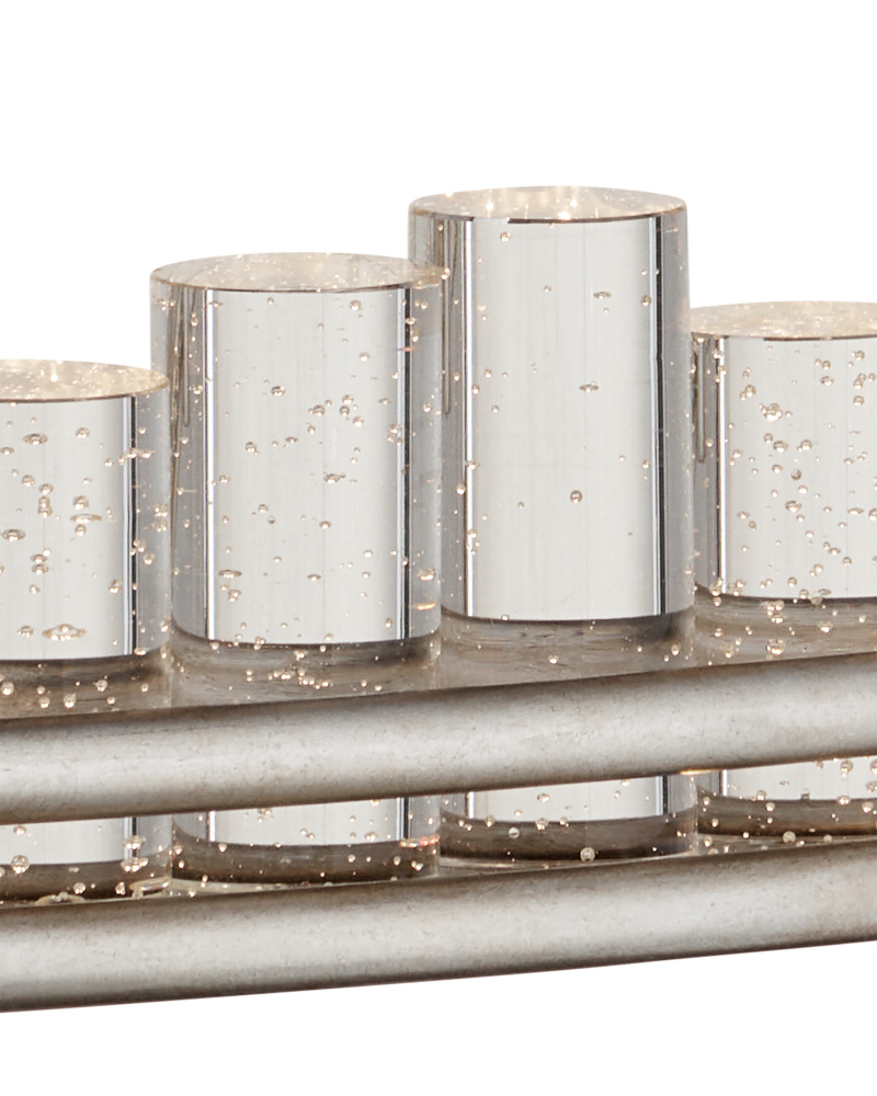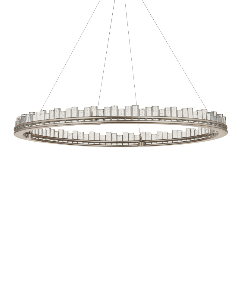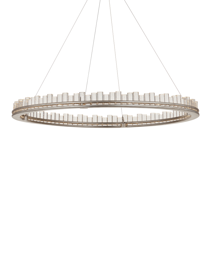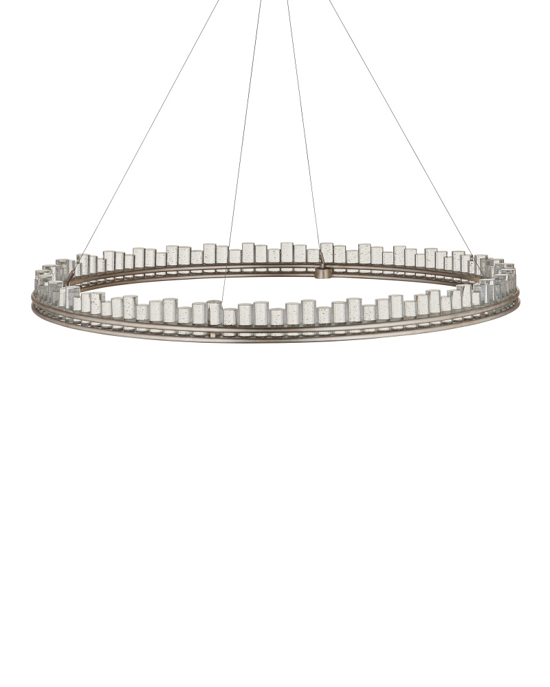 When envisioning the Pleiades Large Chandelier, the goal was to create drama with cylindrical pieces of seeded crystal fitted into a generously scaled silver leaf wrought iron ring. The open design of the ring is essential to enhance the sensational illumination, as it is fitted with an integrated LED strip. The light effervesces when it strikes the bubbles in the crystal rods, adding to the chandelier's allure. The Pleiades is dimmable. Adjustable from 32" to 148" with use of included chain/rod kit/cable. If your space calls for a longer drop, additional chain/rods/cable is available for purchase.