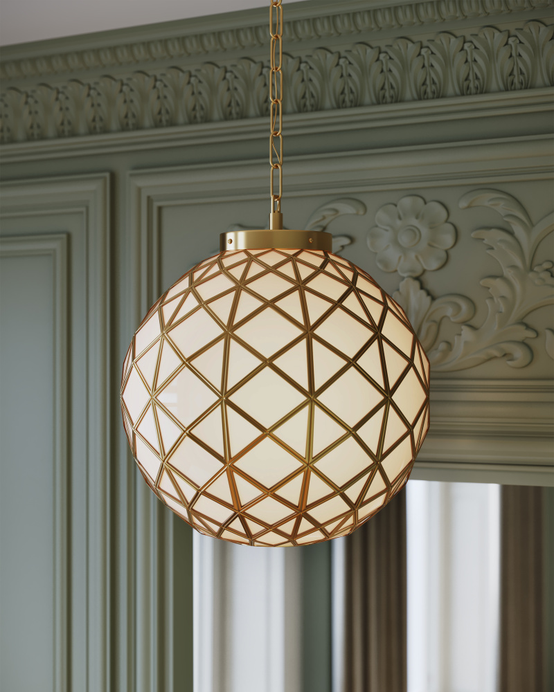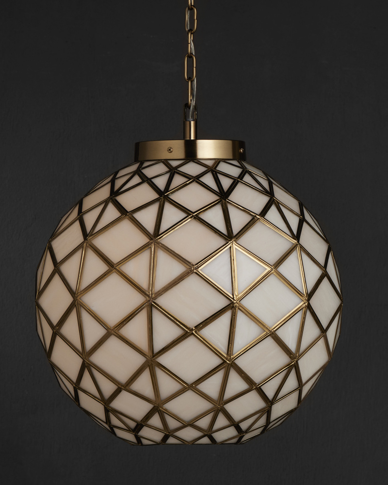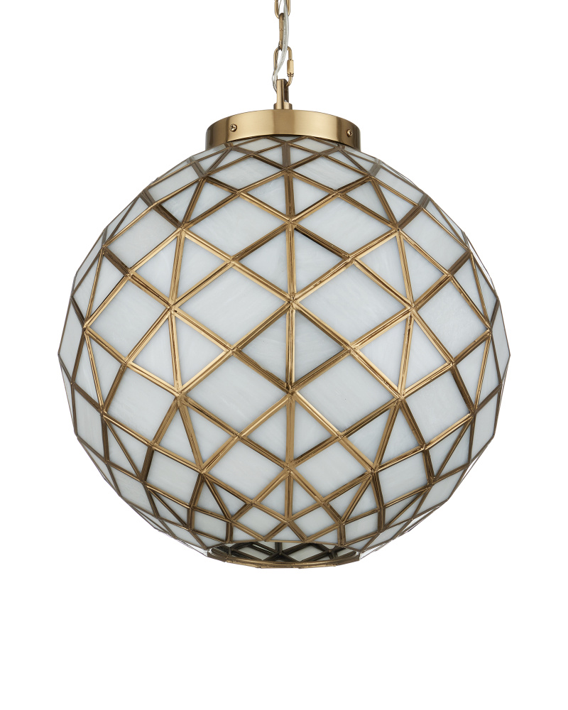 The name of he Polyhedron Small Pendant pays homage to its triangular panes of white glass pieced together between antique brass delineations. Though the glass looks uniform when the illumination warms it, there are subtle drifts of milkier white in some spots that others, which adds a bit of texture to this geometric design. Adjustable from 24.5" to 92.5" with use of included chain/rod kit/cable. If your space calls for a longer drop, additional chain/rods/cable is available for purchase.