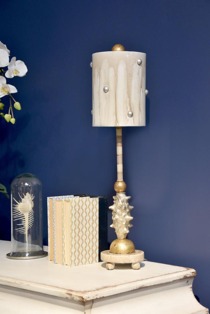 A table lamp with gold-silver striped stem and glazed shade. Its whimsical design suits playrooms, dining areas, or any space with a playful, updated look.