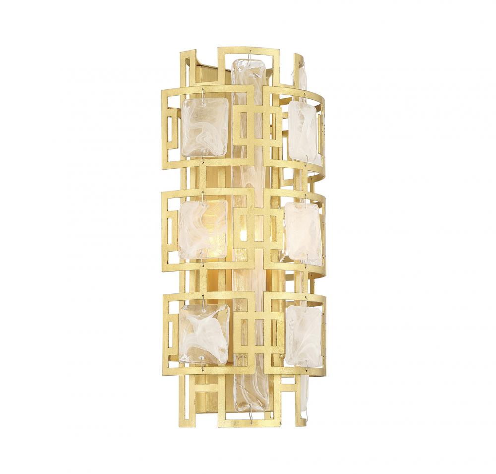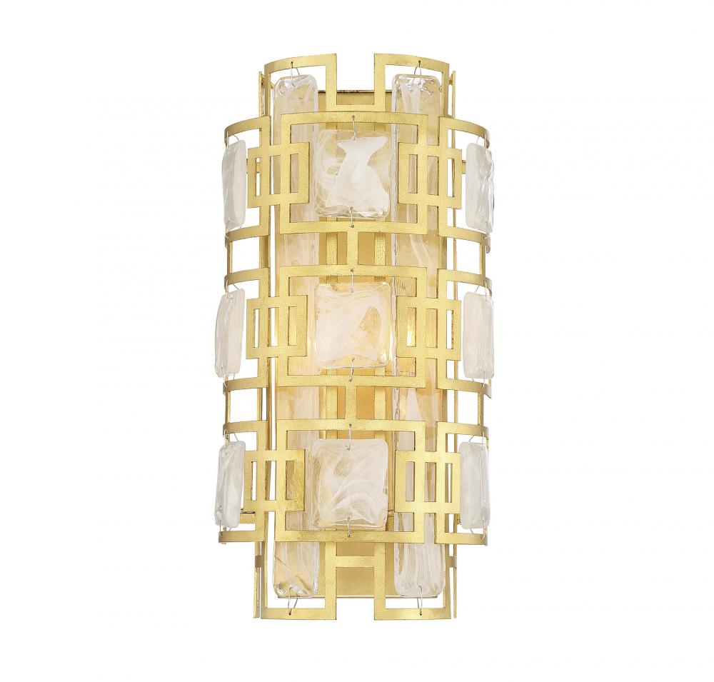 Become mesmerized by the gorgeous geometry of the Savoy House Portia 2-light wall sconce, featuring an eye-catching pattern decorated with pieces of strie piastra glass and finished in a super shimmering True Gold. Portia is 16" in height, 8" in width and extends 4.75" from the wall. It uses two candelabra size bulbs of up to 60 watts per bulb. Damp area rated.