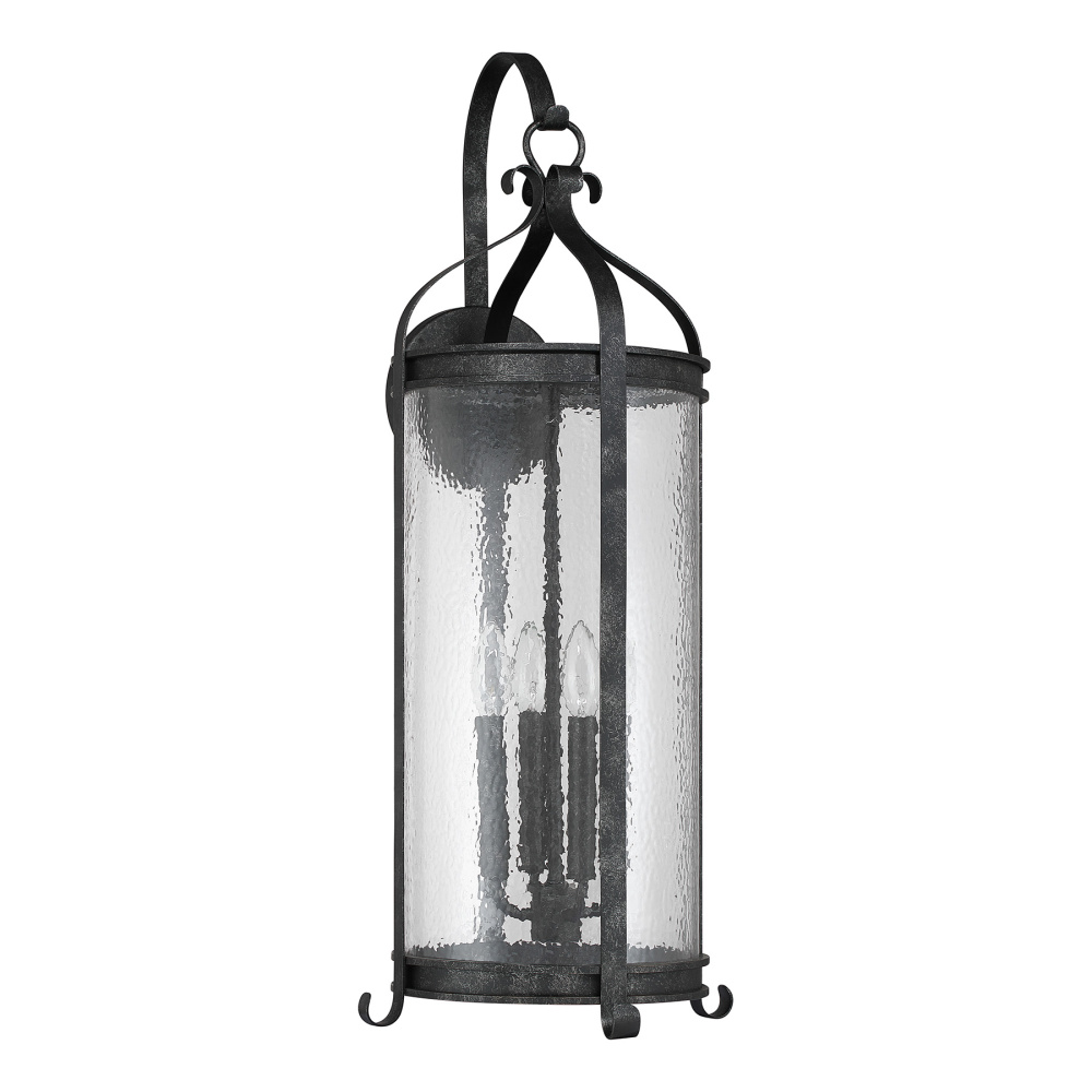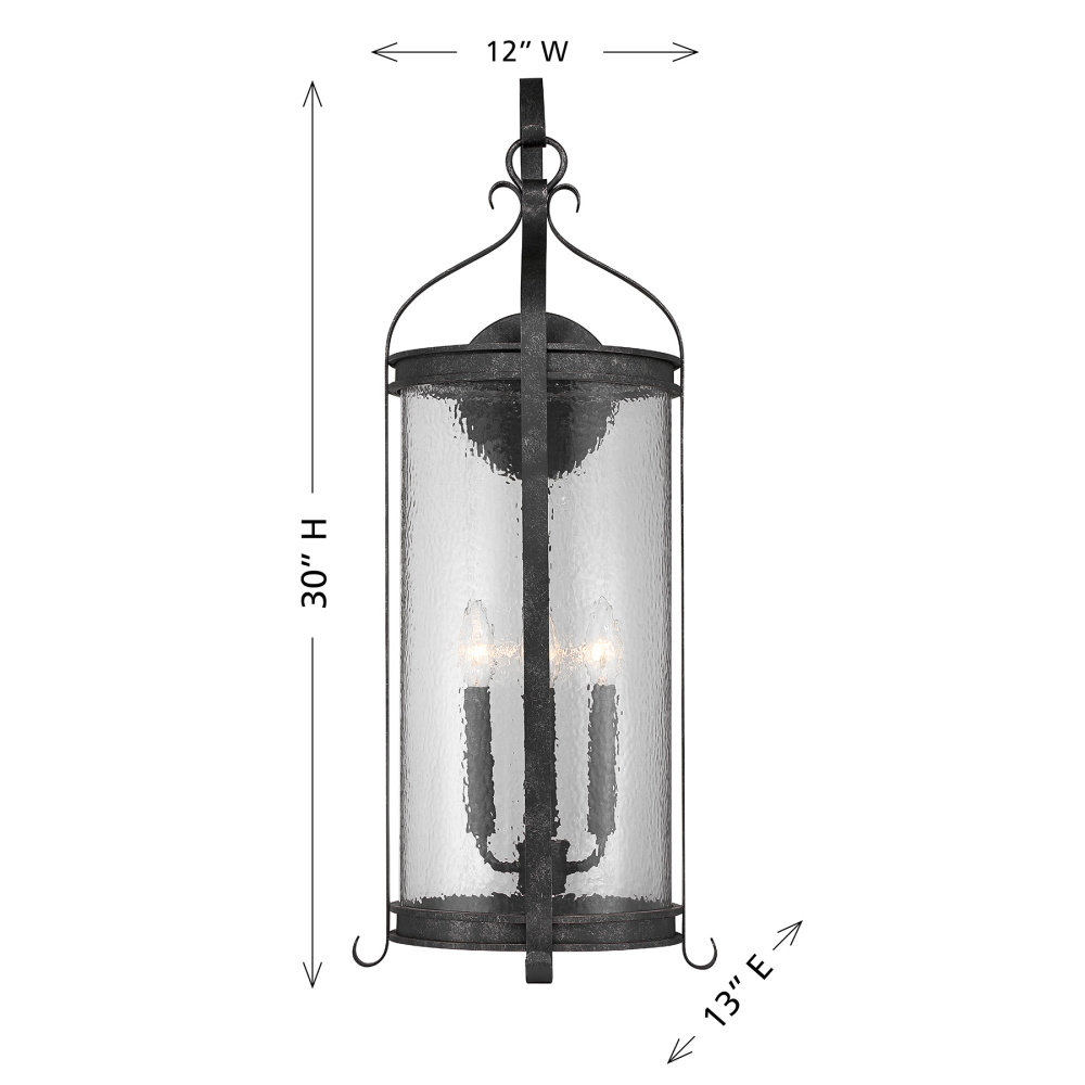 The Savoy House Preston 4-light outdoor wall sconce pairs dramatic height with enduring traditional style. Clear pebbled glass panels shimmer within an elongated frame while decorative flourishes, including the signature shepherd’s hook, add classic charm. The Iron Oxide finish, with its distressed detailing, deepens the visual warmth. Preston stands 30" tall, 12" wide, and extends 13" from the wall. Uses four candelabra size bulbs of up to 60 watts each (bulbs not included). Wet area rated.