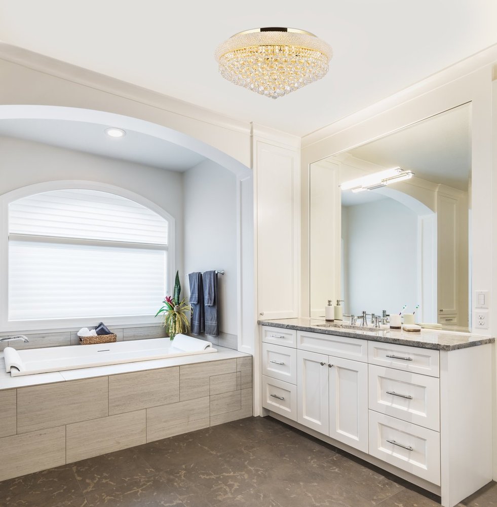 Primo flush-mount fixtures come in finishes of brilliant chrome or gold, which are refracted in the clear crystals
