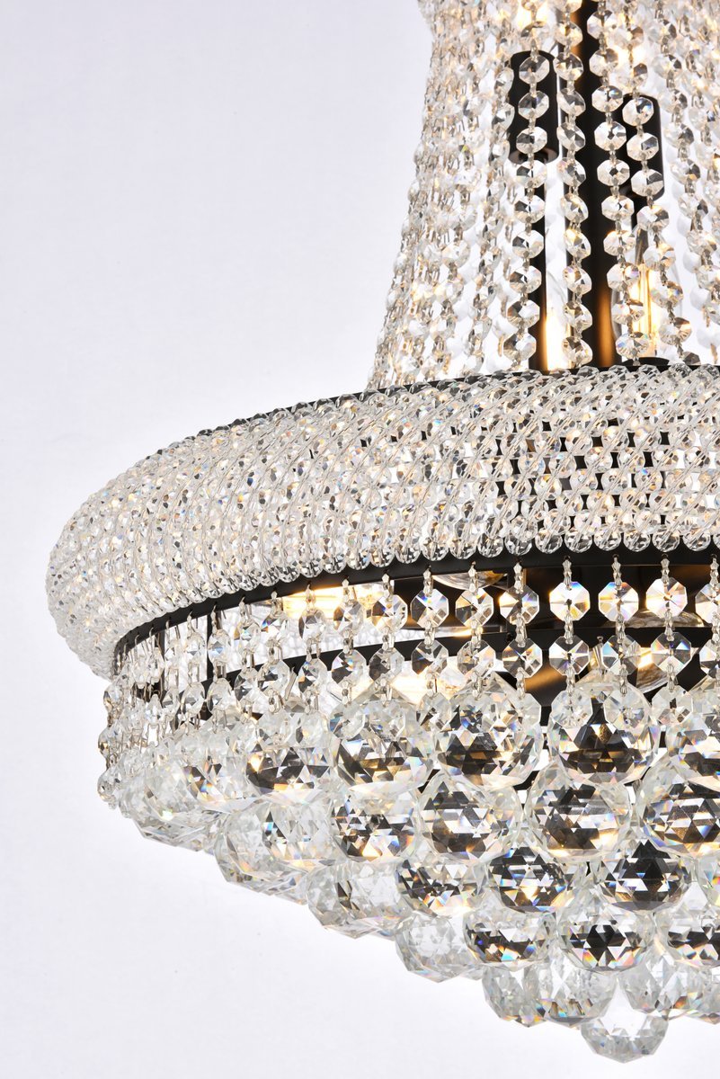 "Primo" means "first" in Italian, and the Primo collection lives up to its name as the top choice in classic, dramatic lighting. The symmetrical bell-shaped design offers variations in Single, double, and triple tiers, with each canopy encrusted with multiple layers of round crystals. Delicate strands of crystals flare out from each canopy, ending in a profusion of crystal octagons and balls in the bottom hemisphere base.