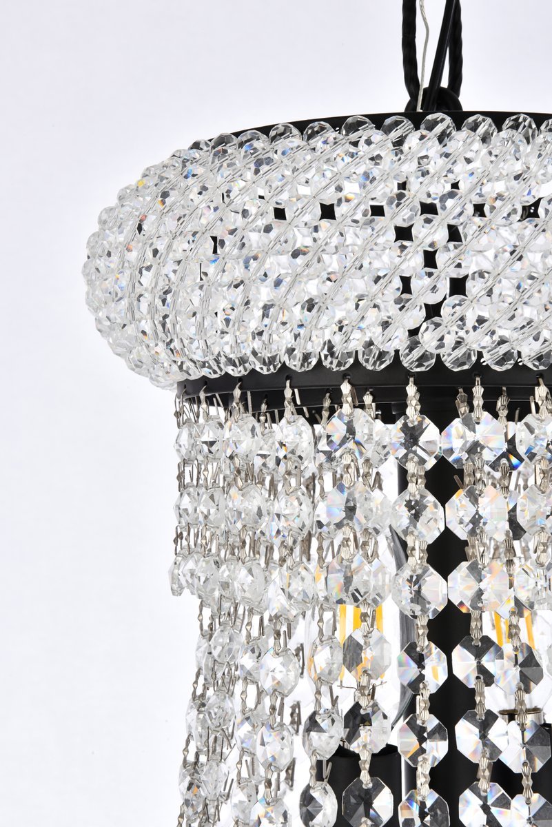 The primo series of hanging fixtures comes in finishes of brilliant chrome or gold or black, which are refracted in the clear crystals.