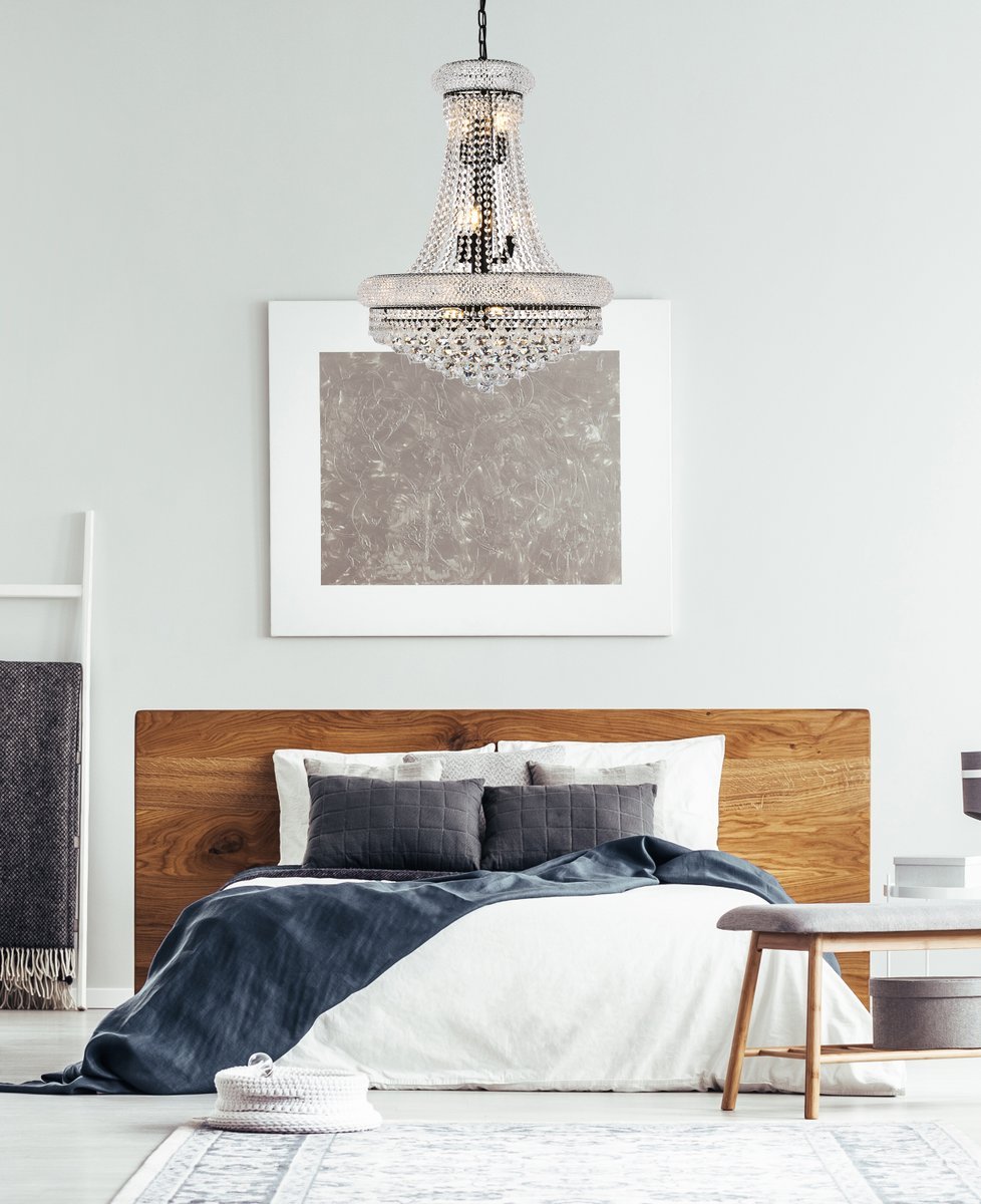 "Primo" means "first" in Italian, and the Primo collection lives up to its name as the top choice in classic, dramatic lighting. The symmetrical bell-shaped design offers variations in Single, double, and triple tiers, with each canopy encrusted with multiple layers of round crystals. Delicate strands of crystals flare out from each canopy, ending in a profusion of crystal octagons and balls in the bottom hemisphere base.