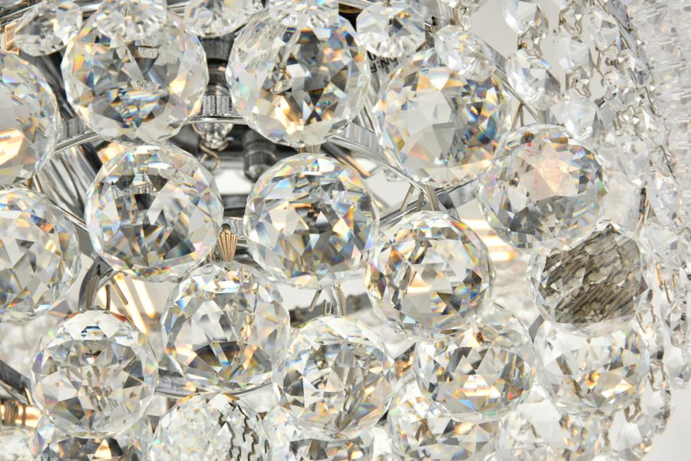 Primo flush-mount fixtures come in finishes of brilliant chrome or gold, which are refracted in the clear crystals