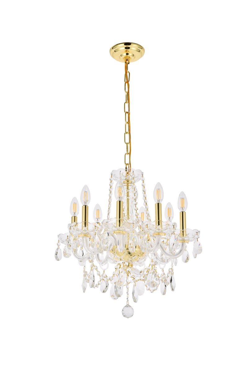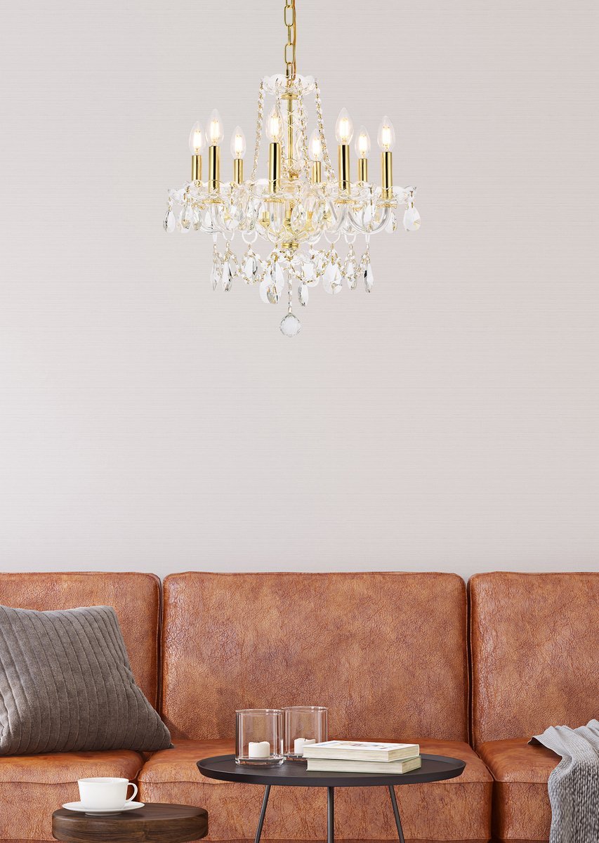 Create a signature hanging fixture in your home through the wondrous options offered in the Princeton collection. The chrome frames are highlighted with a rainbow of finishes coloring the etched-glass center column and bobéches, as well as the graceful glass-covered arms. Select from red, purple, white, black, or clear. Dangling from the delicate bobéches and curved arms are drop crystals in complementary colors of red, black, white, or clear. You can also choose a gold frame with golden-teak or clear crystals. Beneath the four to eight candelabra lights (not included) are draped strands of octagon crystals, with a Single crystal ball finishing off this elegant showpiece. The Princeton collection encourages you to use your imagination to customize a chandelier or pendant lamp that reflects your decorating style in your living room, dining room, bedroom, bathroom, or foyer.