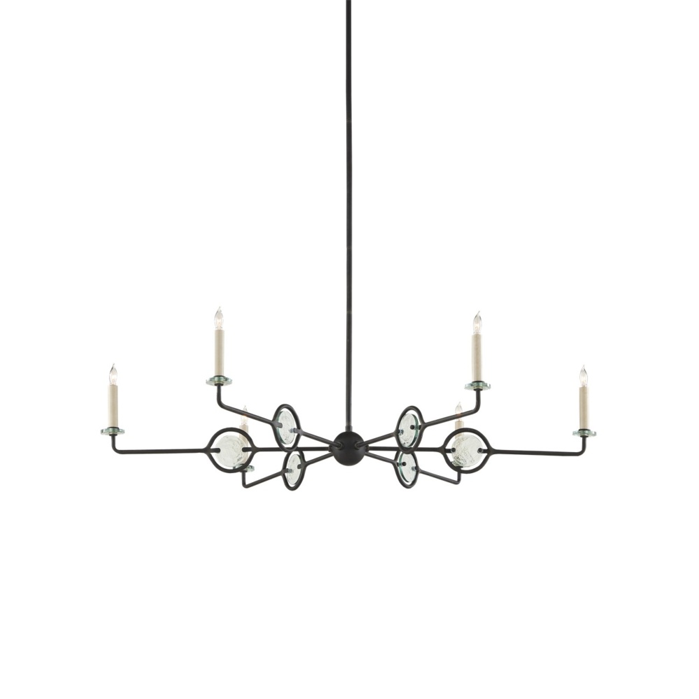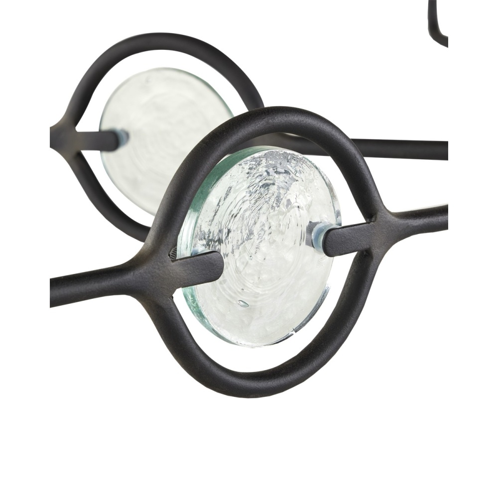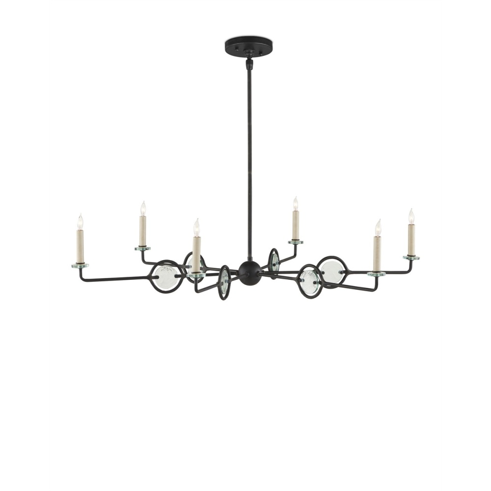The Privateer Chandelier is one of our designs that mixes black with recycled glass in a sophisticated way. The long thin rod that culminates at a cog holding the arms, and the arms and circlets holding the glass pieces are in a blacksmith finish. The bobeches are also glass, and the candle sleeves are in a smokewood finish. Adjustable from 17.625" to 59.625" with use of included chain/rod kit/cable. If your space calls for a longer drop, additional chain/rods/cable is available for purchase.