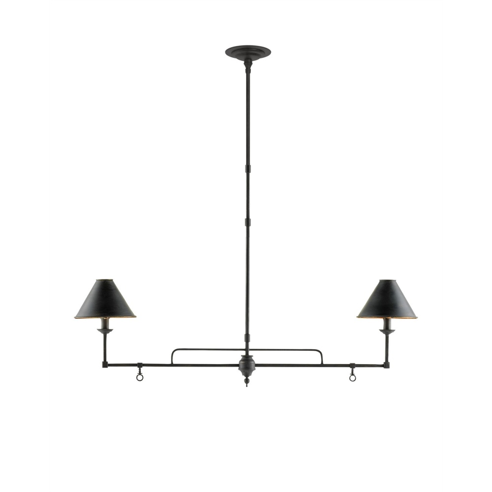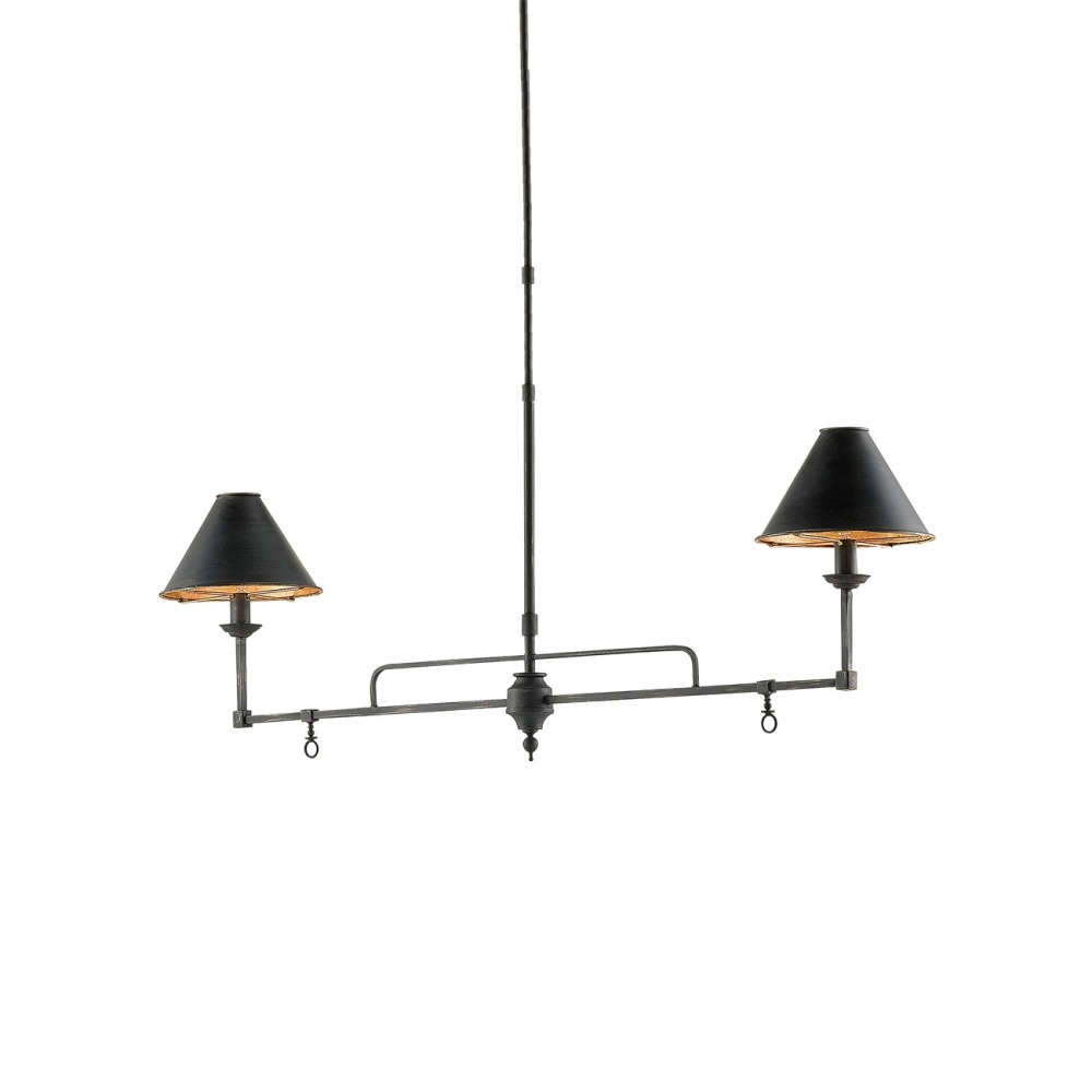A modern take on the traditional gas light, the Prosperity Rectangular Chandelier has a block-accented frame in a French black finish. The contemporary gold leaf finish on the interiors of the two shades brings an opulence to the illumination. Adjustable from 24.5" to 60.5" with use of included chain/rod kit/cable. If your space calls for a longer drop, additional chain/rods/cable is available for purchase.