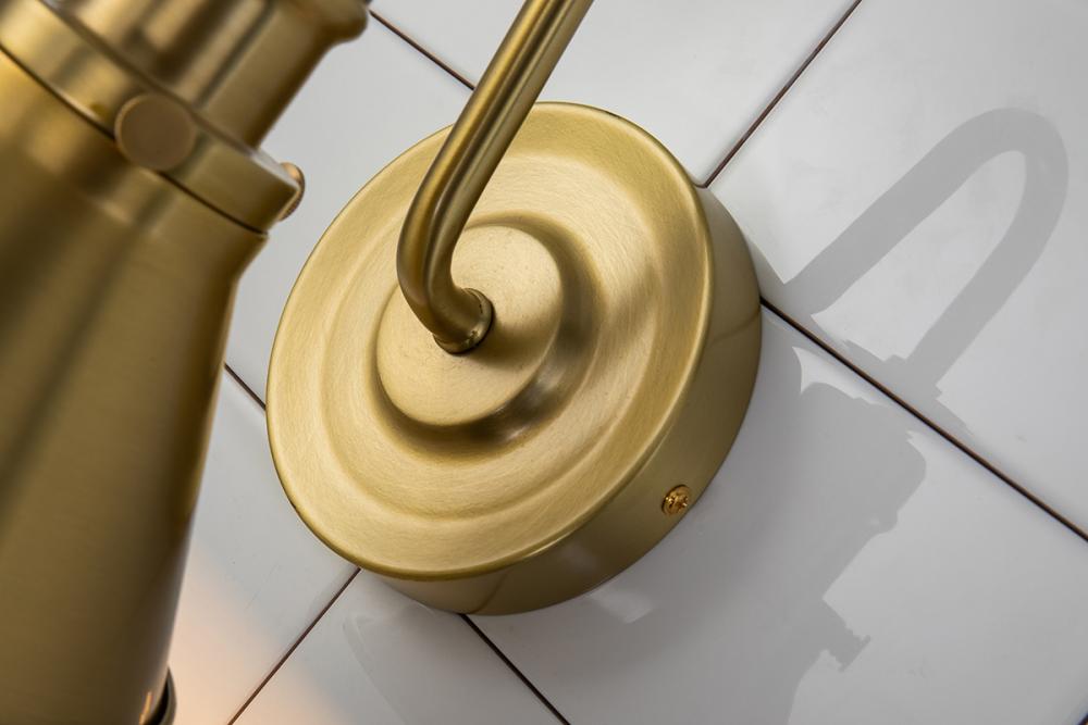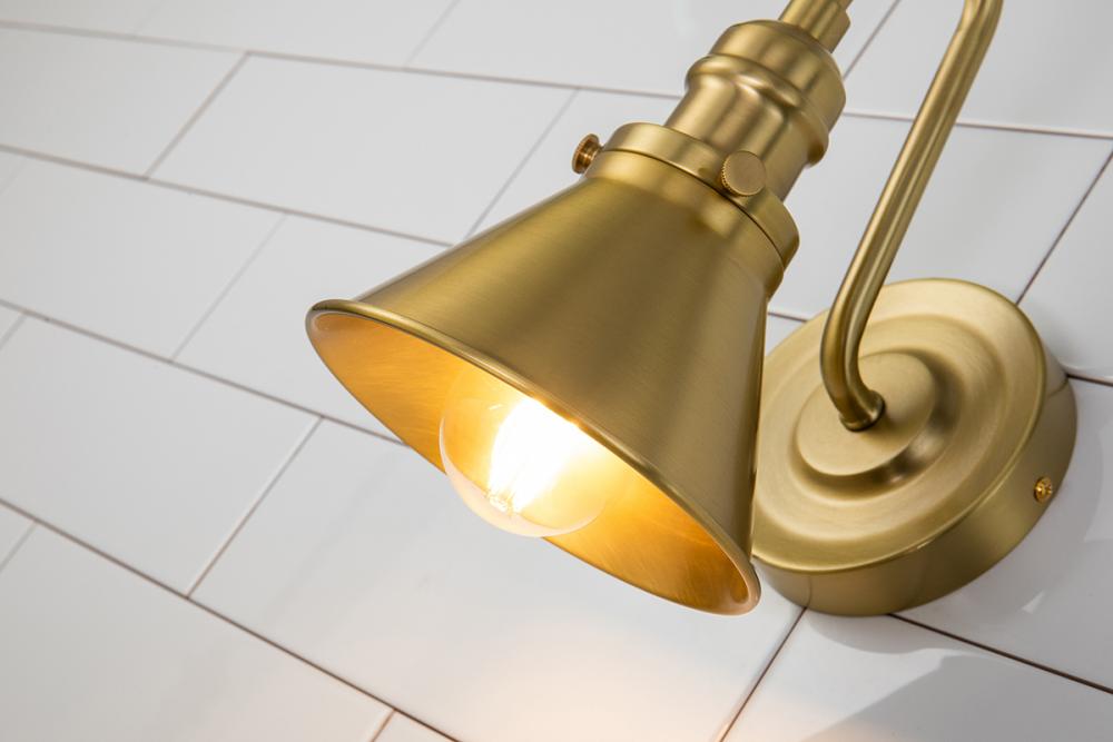 A 1-light aged brass sconce with an arched arm and cone shade. Its modern farmhouse design suits damp spaces, perfect for mirror sides or art with vintage charm.