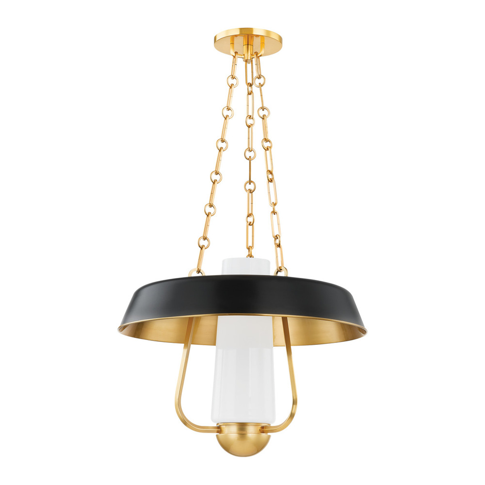 A modern reimagining of a vintage hurricane lamp, this stylish pendant light blends a sense of heritage with contemporary usability. While the Aged Brass framework and thick chains add to the antique feel of this fixture, the decorative shade in either Soft Sand or Soft Black adds a fresh feel. The large opal glossy glass tube at the center provides comforting illumination over a large area.