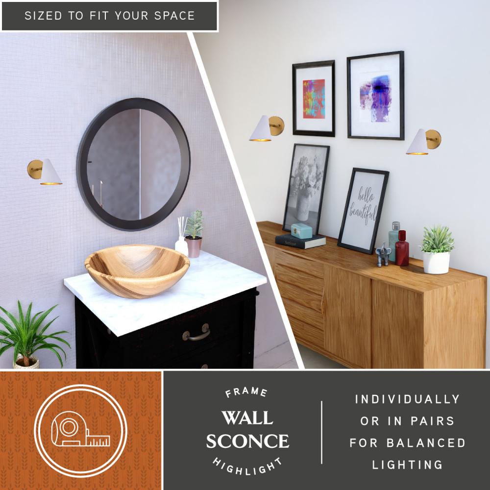 A sophisticated blend of mid-century modern with contemporary styling, the Pryce interior lighting collection is all about the finer details. A tapered matte white metal shade suspends from a slim gold satin brass arm. This indoor wall lamp is ideal for a variety of areas including the bathroom vanity, hallway, kitchen, bedside, or anywhere there is a need for extra light.