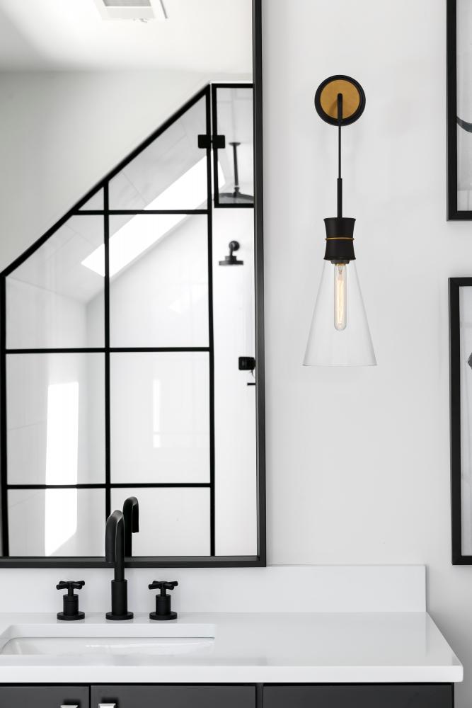 The Quinn Collection is a bold, modern statement piece that combines form and function effortlessly. With its striking two-tone finish, it immediately catches the eye. Its transparent glass cone shade is a stunning focal point, allowing a single bulb to disperse warm and inviting light, creating a welcoming and chic atmosphere. (Bulb not included.)