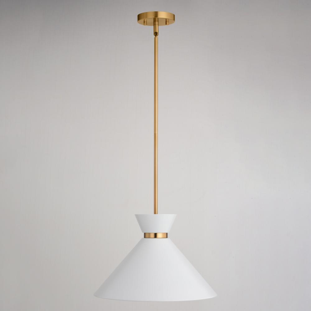 The Racine bowtie-shaped metal shade in matte white and natural brass captures the glamorous mid-century modern style. Height is adjustable with the included down rods; compatible with sloped ceilings. Sized right to be installed individually or in a pair; ideal for kitchens, dining areas, or bar areas.