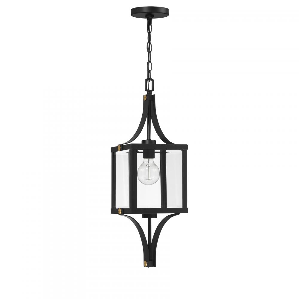 Make your outdoor lighting super fashionable with the Savoy House Raeburn 1-light outdoor hanging lantern. A central cube of beveled clear glass is surrounded by a boldly structured frame finished in Matte Black and adorned with thoughtful detailing in Weathered Brushed Brass. Raeburn is 25" in height and 8.5" in width. Uses one standard size bulb of up to 60 watts. The bulb is not included. Damp area rated.