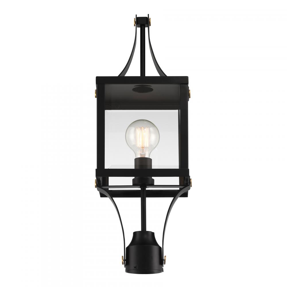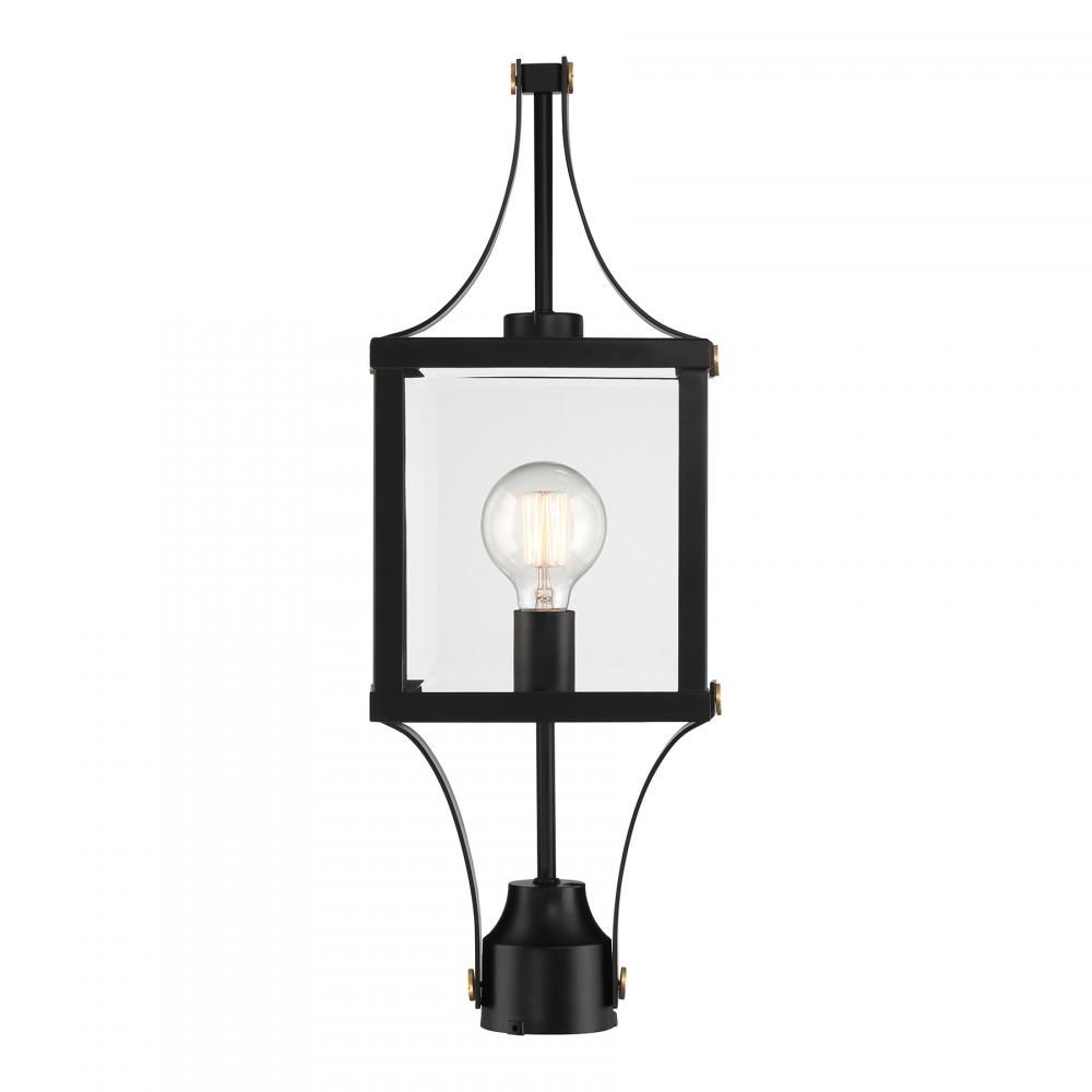 Make your outdoor lighting super fashionable with the Savoy House Raeburn 1-light outdoor post lantern. A central cube of beveled clear glass is surrounded by a boldly structured frame finished in Matte Black and adorned with thoughtful detailing in Weathered Brushed Brass. Raeburn is 23.5" in height and 8.5" in width. Uses one standard size bulb of up to 60 watts. The bulb is not included. Wet area rated.