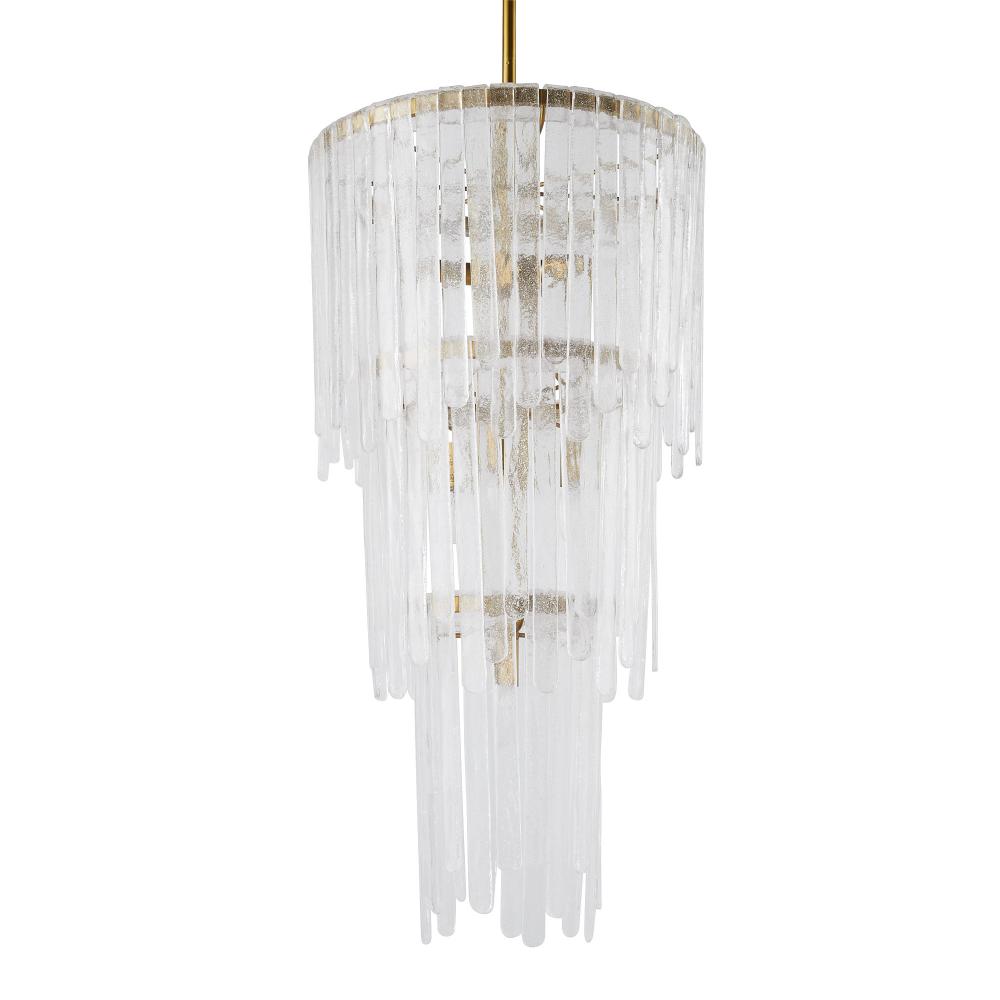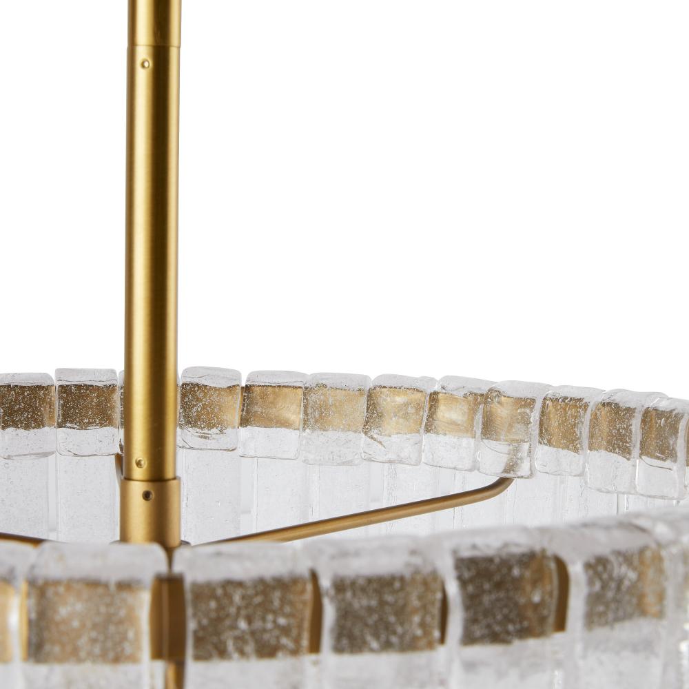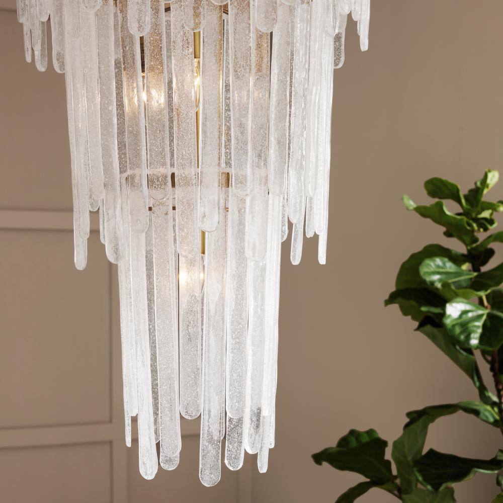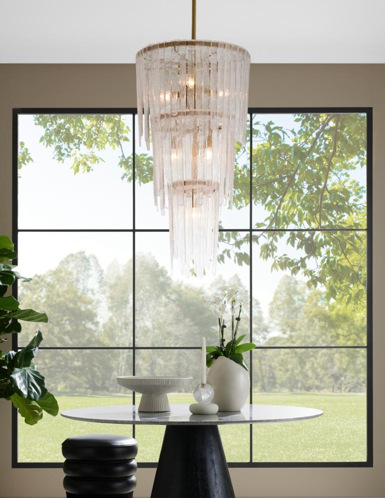 Our Raine chandelier was inspired by vintage Murano glass lighting popular in the ‘60s and ‘70s. Its teardrop silhouette is embellished with rounded layers of lustrous clear seedy slump glass, in staggered sizes folded over a tiered steel frame. Finished in antique brass, the result is a dramatic and textural waterfall effect. Glass can be removed to provide additional illumination if desired. Finish will vary.