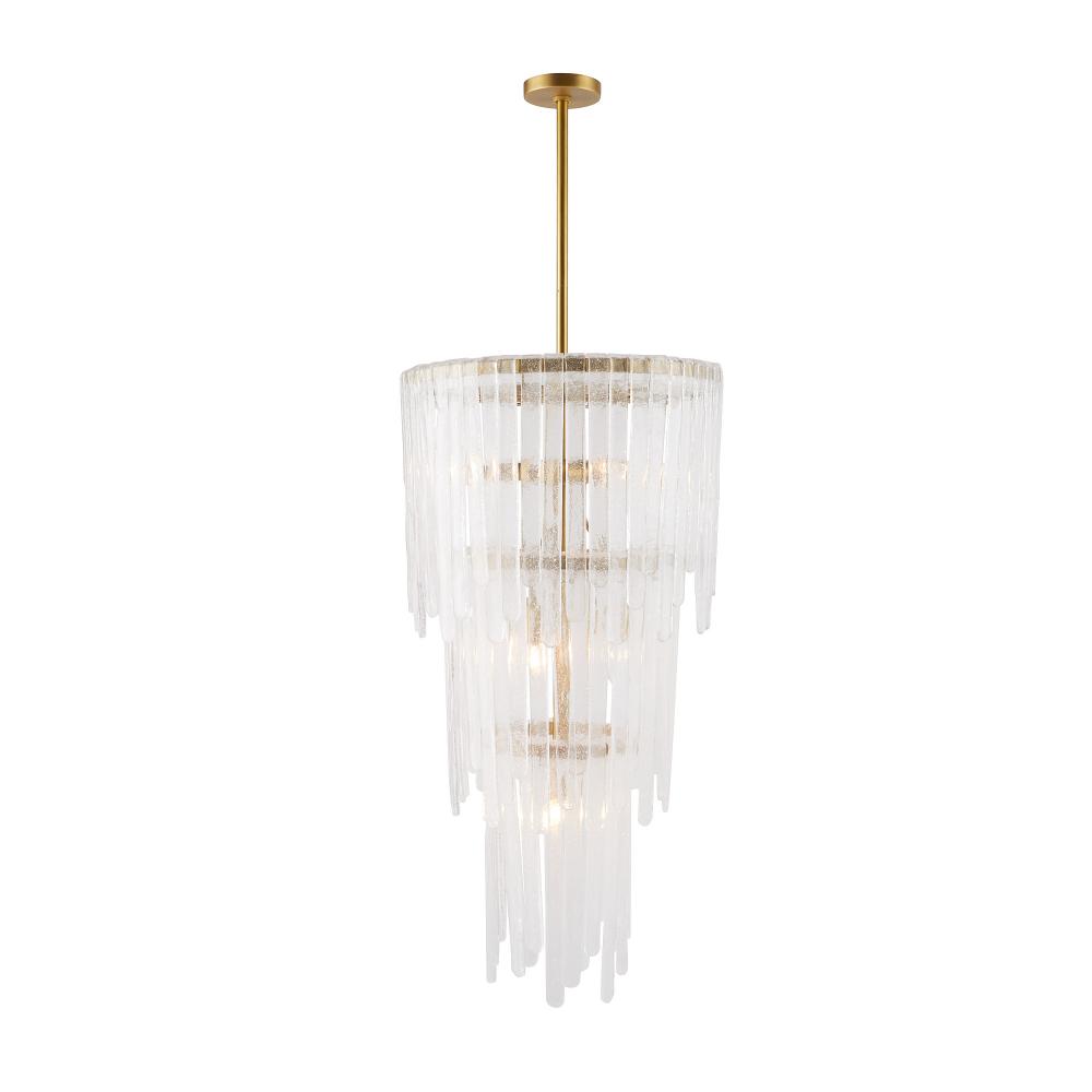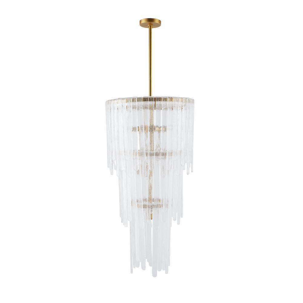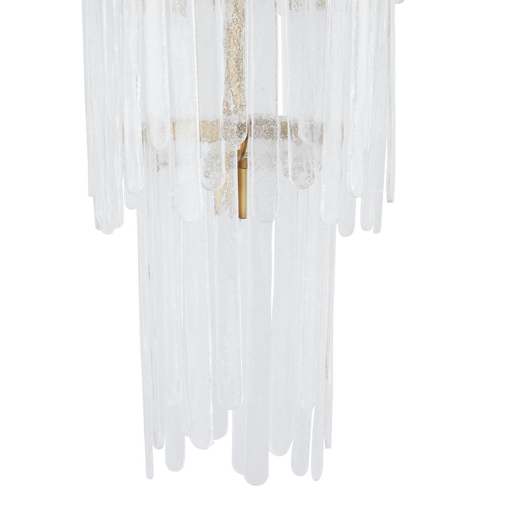 Our Raine chandelier was inspired by vintage Murano glass lighting popular in the ‘60s and ‘70s. Its teardrop silhouette is embellished with rounded layers of lustrous clear seedy slump glass, in staggered sizes folded over a tiered steel frame. Finished in antique brass, the result is a dramatic and textural waterfall effect. Glass can be removed to provide additional illumination if desired. Finish will vary.