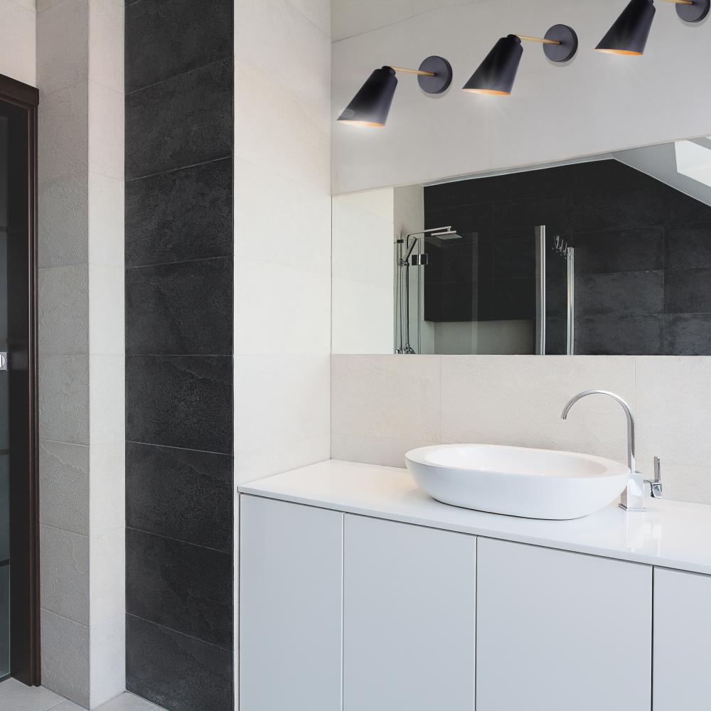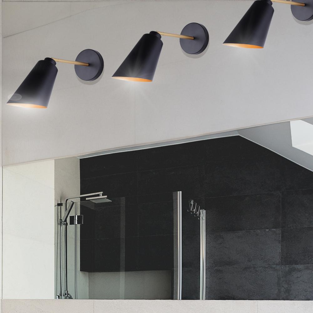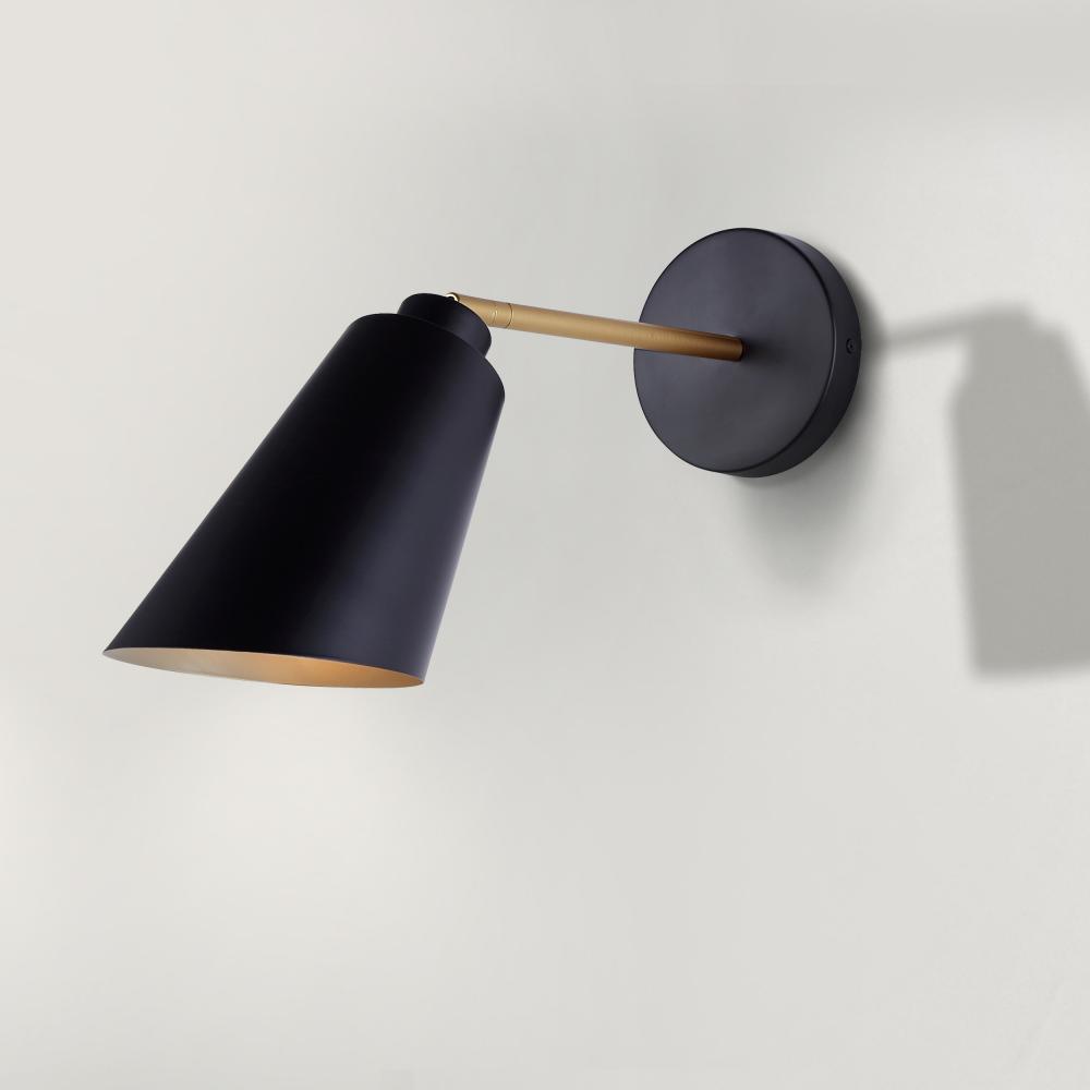 Illuminate your bathroom with our sleek 1-light vanity light, a perfect blend of modern elegance and retro charm. Featuring a matte black finish with painted gold accents, this fixture adds a touch of sophistication to any space. Its mid-century modern design makes it a stylish addition, ideal for contemporary interiors. Measuring 5 1/8 inches wide, 12 inches high, and 11 2/3 inches deep, it fits seamlessly in smaller spaces. Rated for damp locations, it's perfect for bathroom lighting, ensuring both style and functionality. Compatible with one 60W Type A bulb, this modern vanity light provides just the right amount of illumination.