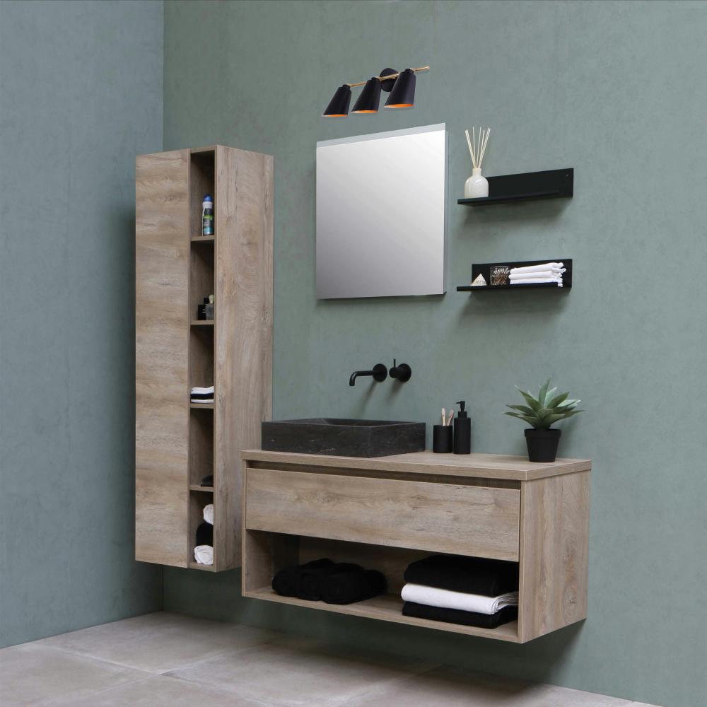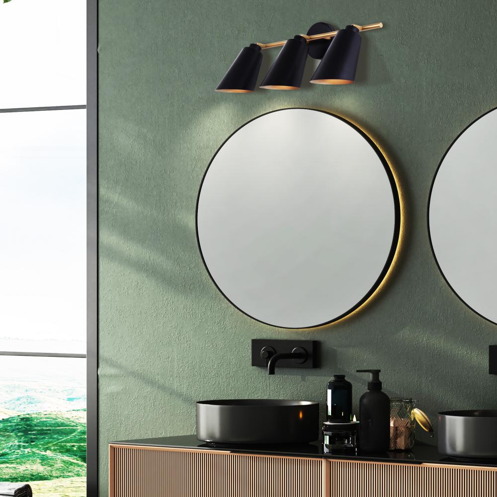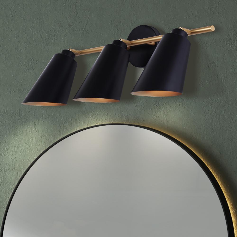 Upgrade your bathroom with our sleek 3-light vanity light, designed to blend modern aesthetics with a touch of retro charm. Featuring a striking matte black finish complemented by painted gold accents, this fixture adds a sophisticated flair to any space. Its mid-century modern design makes it an eye-catching addition, perfect for contemporary interiors. Measuring 23 inches wide, 12 inches high, and 7 inches deep, it fits seamlessly above your mirror. Rated for damp locations, it's ideal for bathroom lighting, ensuring both style and functionality. Compatible with three 60W Type A bulbs, this modern vanity light illuminates your space beautifully.