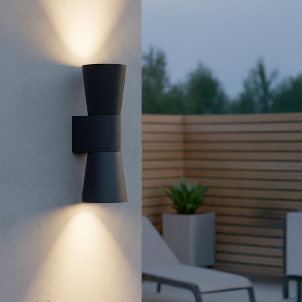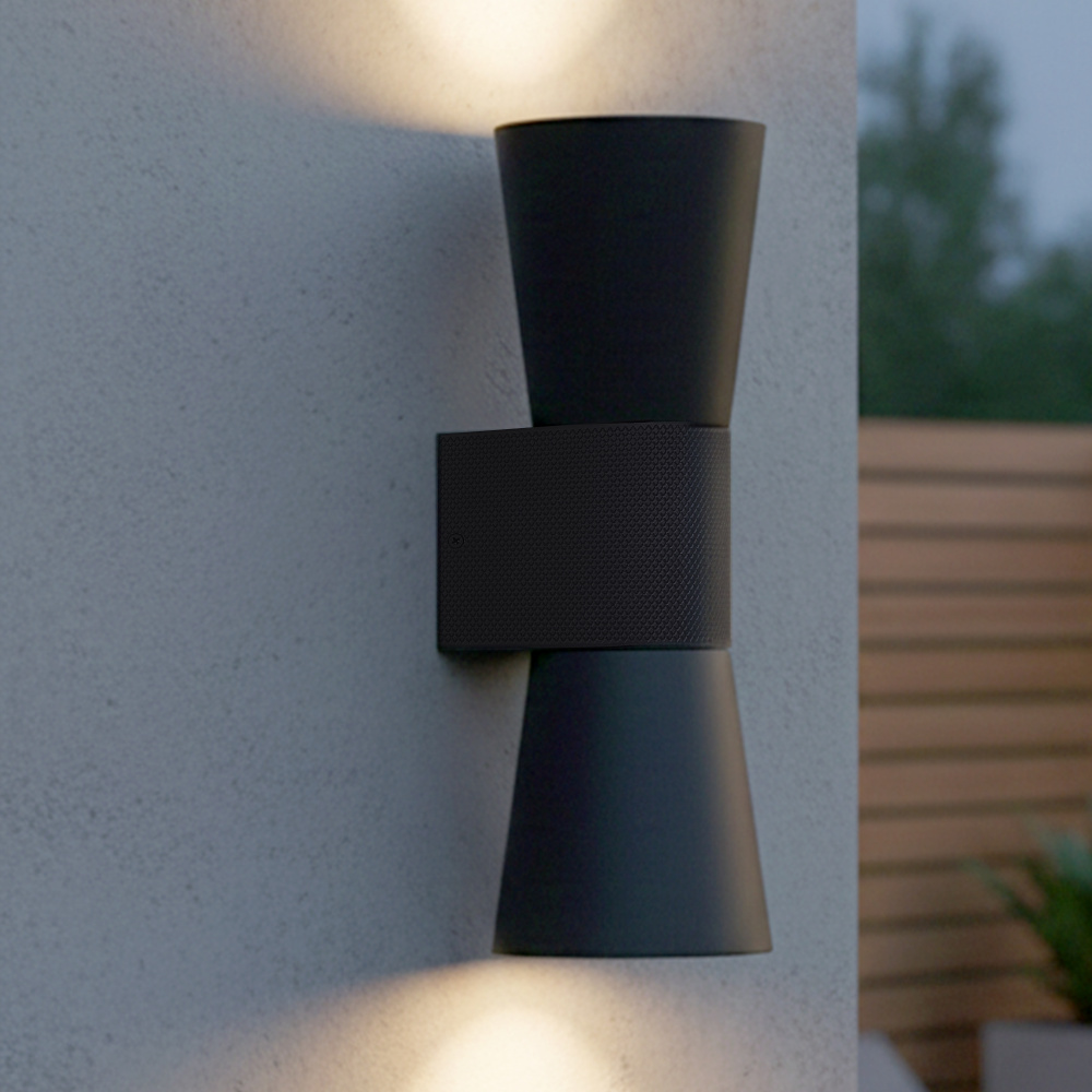 Modern Outdoor Design: RAMI's clean sand black finish and frosted glass panels create a sleek, architectural look. The up-and-down light effect adds depth and dimension, enhancing exterior walls with subtle sophistication.