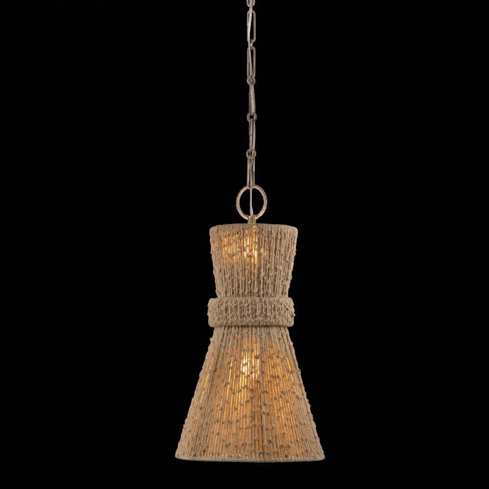 Crafted with a hand-knotted jute string technique, the designs of the Raphael family are like artful ornaments. Each fixture has a central cuff that cinches the conical shades, giving them their distinctive shapes. A hidden bulb radiates light through the gaps in the weave, creating a warm and welcoming glow. For added cohesion, the pendants feature a decorative string-wrapped loop that connects to a Patina Brass chain.Due to the one-of-a-kind nature of the medium, exact colors and patterns may vary slightly from the image shown.