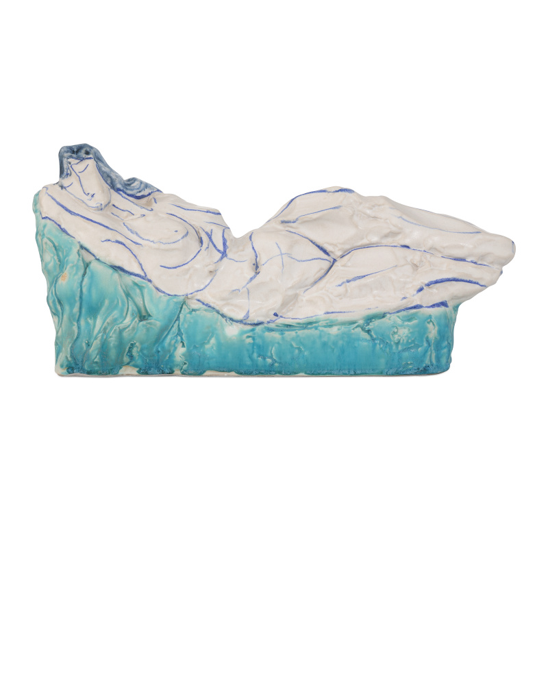 The Reclining Nude Object is a brutalist sculpture with an edgy composition. Crafted from porcelain, the decorative accessory features a sleeping woman with a serene expression rendered in bold lines in turquoise and bright blue over a soft off-white ground. The sculpture has a Fauvist feel similar to the work of Raoul Dufy. Because each piece is painted by hand, the line-weight and coverage of the glazes will vary slightly.