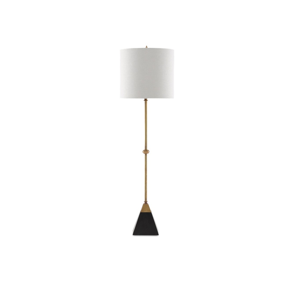 A slender form made of brass with a tapered granite base makes the Recluse Table Lamp apropos for so many design styles. The vintage brass finish on the metal and the pyramid-shaped black granite base combine to anchor the brass lamp topped with a bone linen shade.
