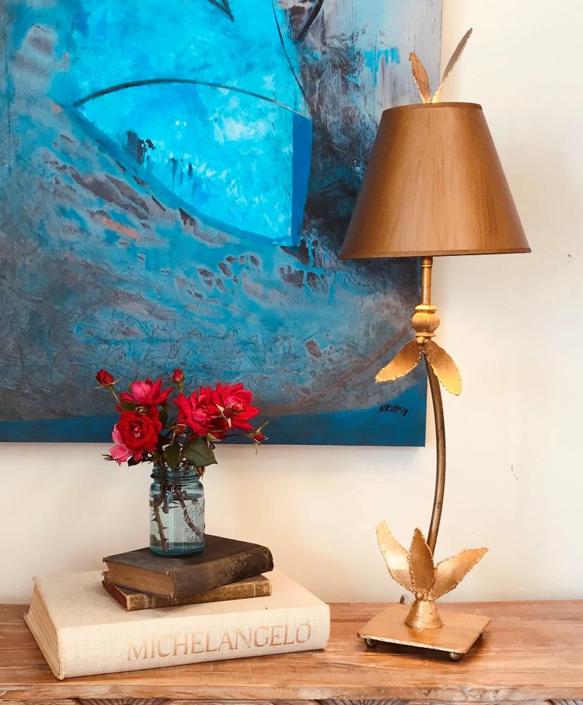 This 30" Red Bell Buffet Table Lamp in distressed gold by Lucas McKearn features a hand-sculpted leaf design. Its gold leaf column and leaf finial add vintage charm to modern living rooms or bedrooms.