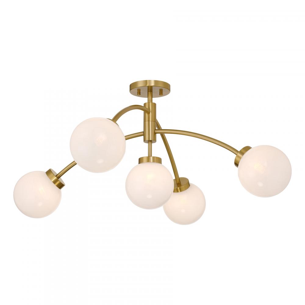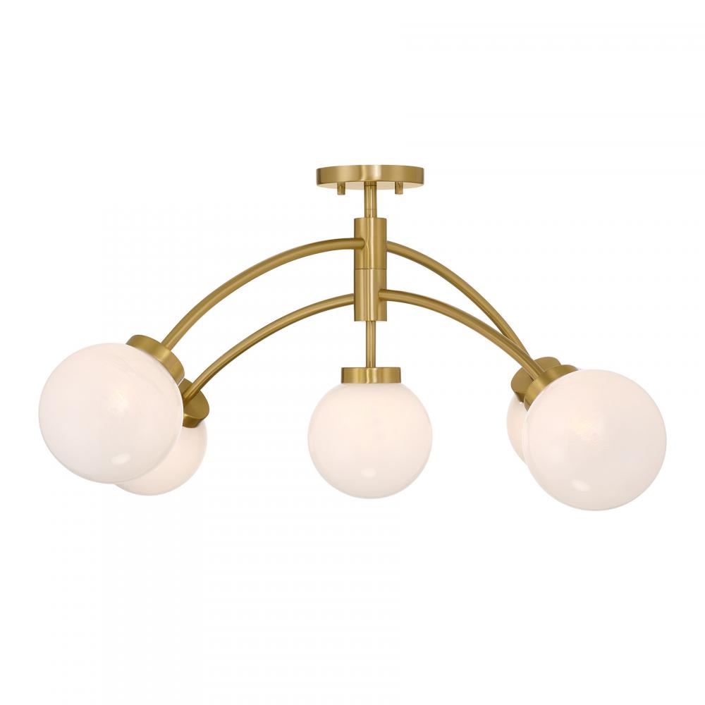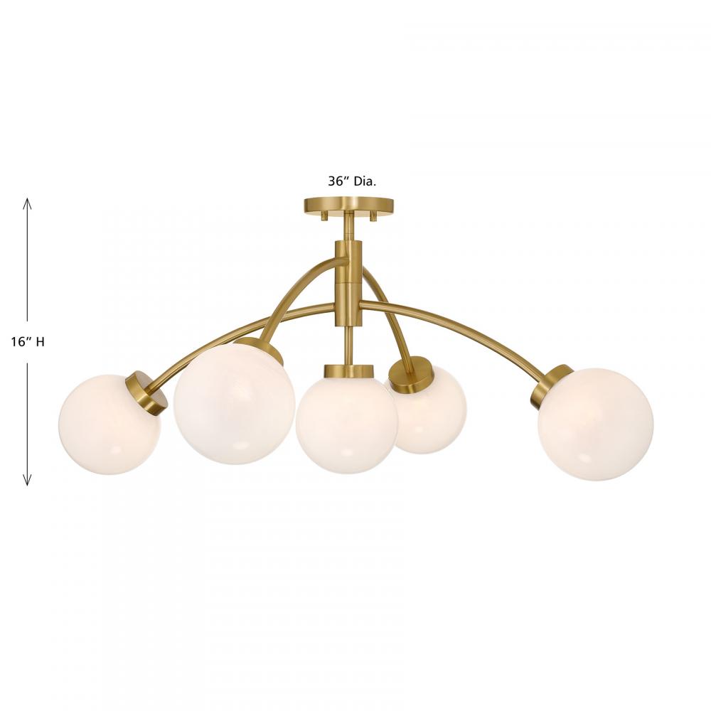 Bring in the big, bright and bold Savoy House Redfield 5-light semi-flush mount! Dazzling with mid-century modern inspiration, its curving arms hold orbs of swirling, stunning white strie glass that pairs beautifully with the Warm Brass finish. Redfield is 16" in height and 36" in width, making it an excellent choice for illuminating large rooms. It uses five G9 LED bulbs of up to 3.5 watts per bulb. Bulbs not included.