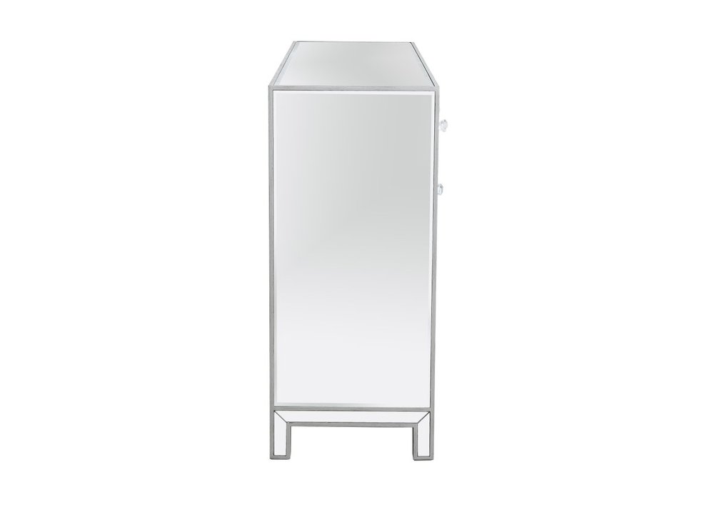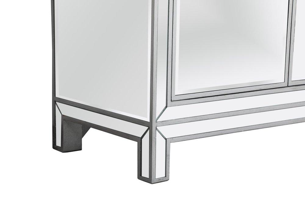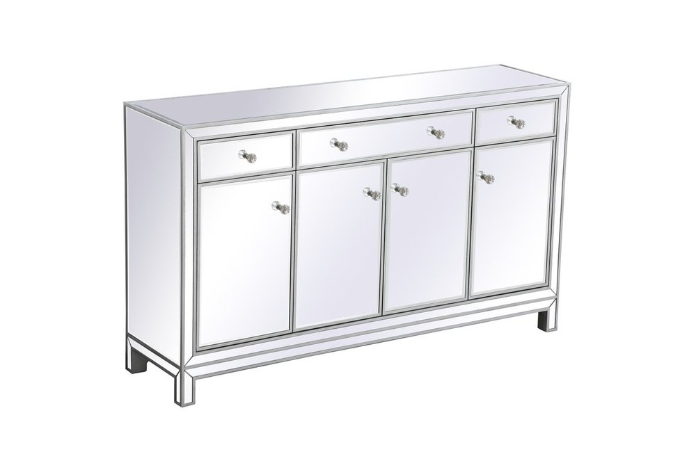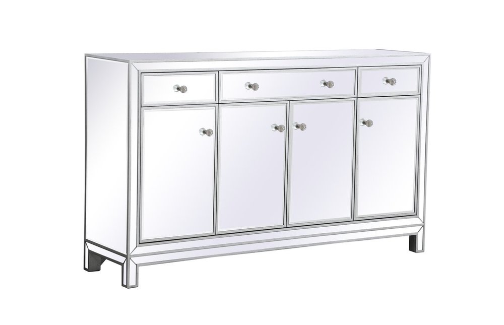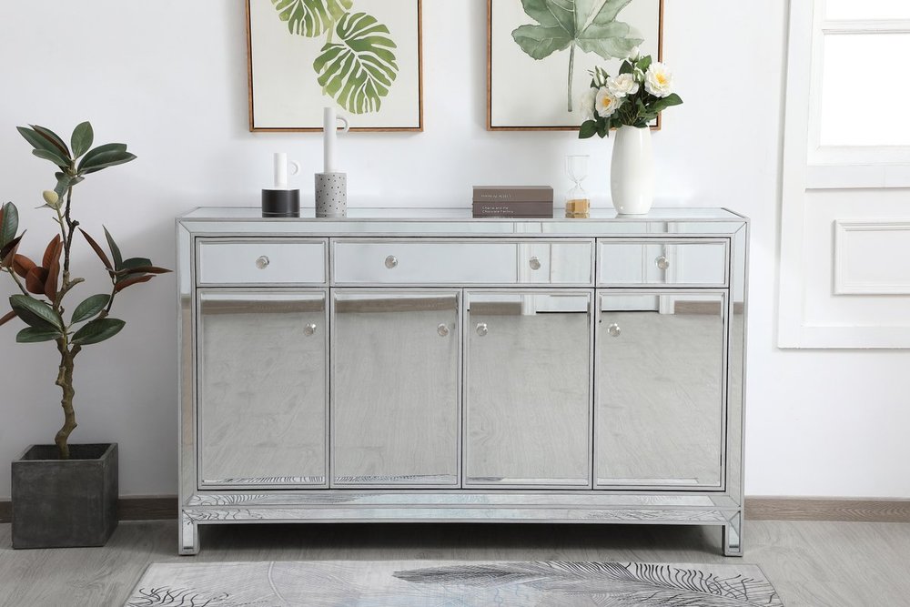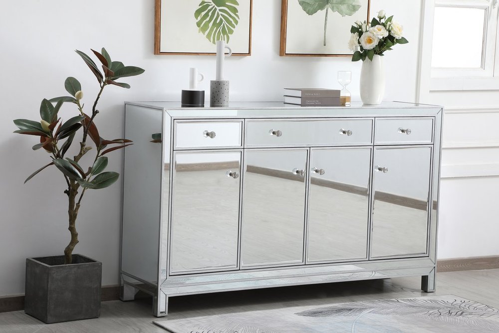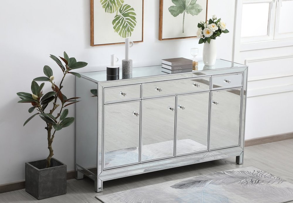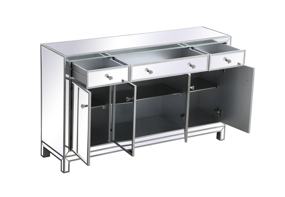 Bring plenty of storage space and modern style to your living room, dining room or entryway with this mirrored credenza. This was made to withstand everyday use. Deep drawers to hold up to 66 pounds and opens quietly. Four doors open to reveal one shelf in each cabinet for barware, fine china, and table linens. This versatile credenza blends in easily with any décor and easy to maintain. Ships fully assembled and ready to use. With anti-tip straps included for added security, this modern addition will complete your room.