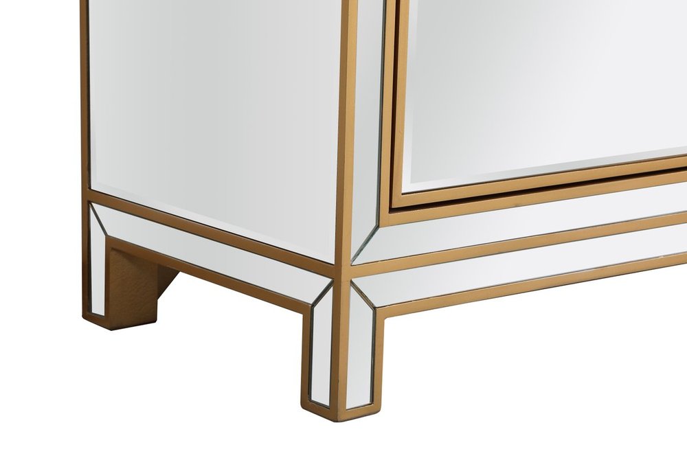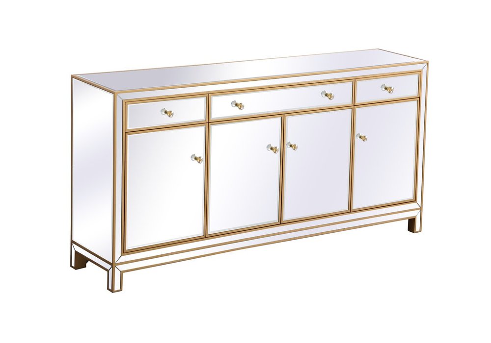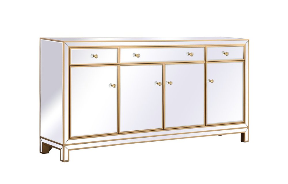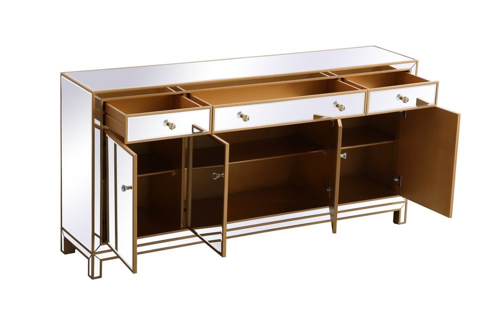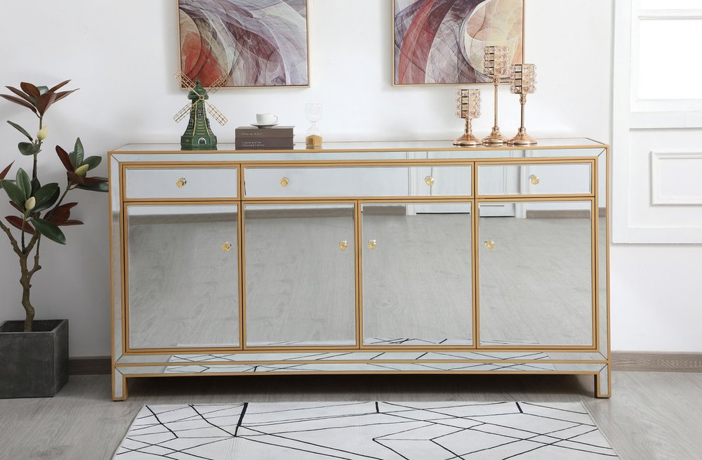 Bring plenty of storage space and modern style to your living room, dining room or entryway with this mirrored credenza. This was made to withstand everyday use. Deep drawers to hold up to 66 pounds and opens quietly. Four doors open to reveal one shelf in each cabinet for barware, fine china, and table linens. This versatile credenza blends in easily with any décor and easy to maintain. Ships fully assembled and ready to use. With anti-tip straps included for added security, this modern addition will complete your room.