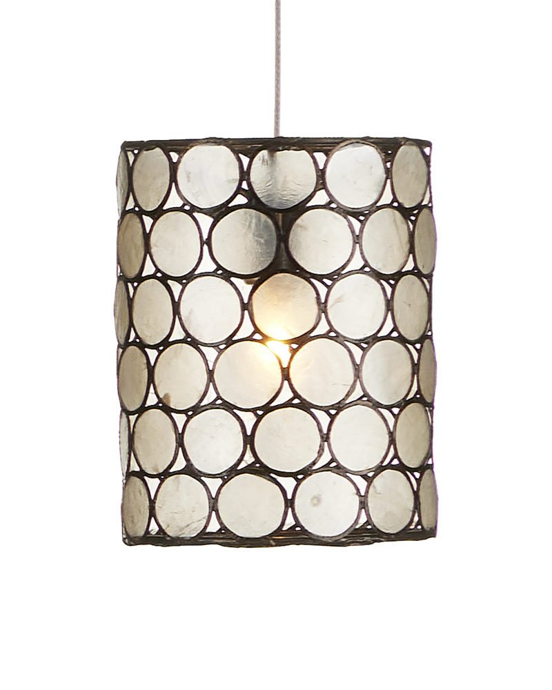 Natural Capiz shell and wrought iron in a Cupertino finish create a luminous circular pattern on the shades of the Regatta Round 7-Light Multi-Drop Pendant. Each cylindrical element has such a pleasing glow when light shines through the lustrous natural material. There is great artistry in achieving such a complex pattern, as each slice of shell has to be surrounded in metal and soldered into a frame once the metal circles are joined to each other. The canopy of this piece is luminous in a painted silver finish. This fixture is among Currey & Company's multi-drop pendant collection, which includes multiple configurations.