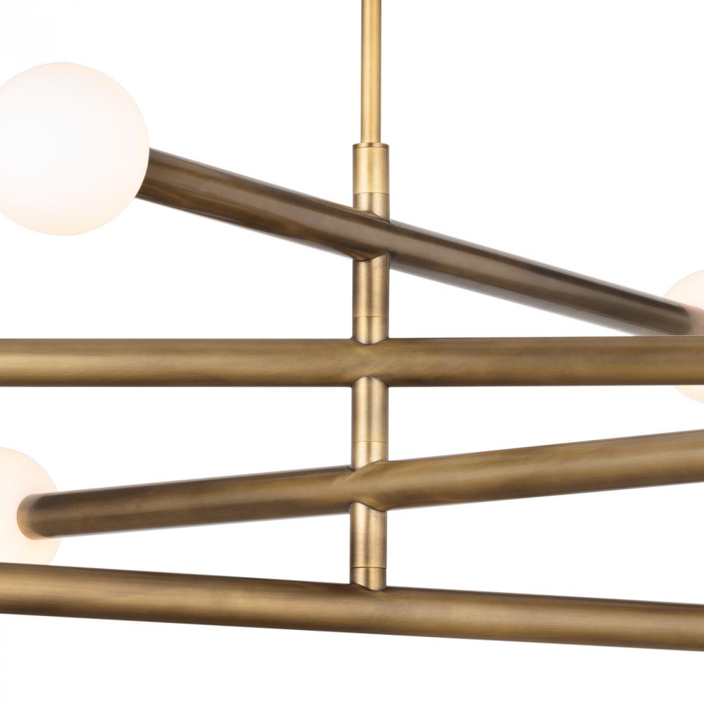 Four arms swivel around a center point on our modern, linear Beaubien Chandelier. Create a unique, dynamic design in your modern loft, entryway, or over a dining table. Beaubien's white glass, globe bulb covers add the perfect amount of diffused light to your space.