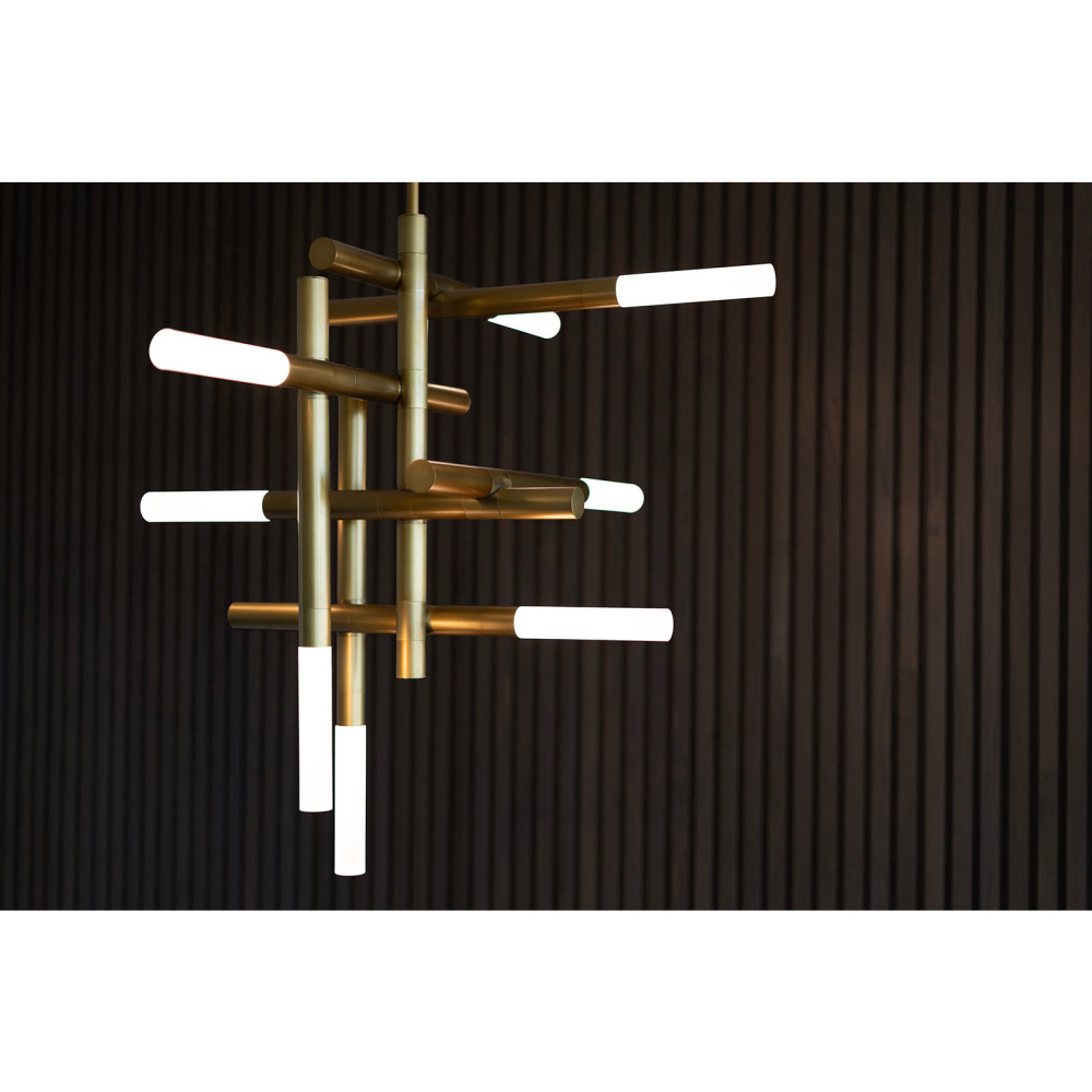 The Cass Chandelier is a modern interplay of vertical and horizontal arms adorned with frosted acrylic diffusers enclosing LED bulbs. With its striking presence and grid-like form, this chandelier takes center stage, elevating an entry, dining or living room.