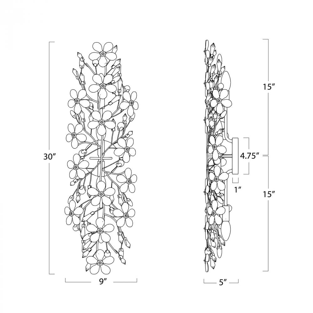 Delicately crafted crystal flowers suspended by a gold-leafed frame give this sconce a strikingly romantic feel. The hand-polished flowers refract light into brilliant sparks, making this fixture a truly dazzling statement piece.
