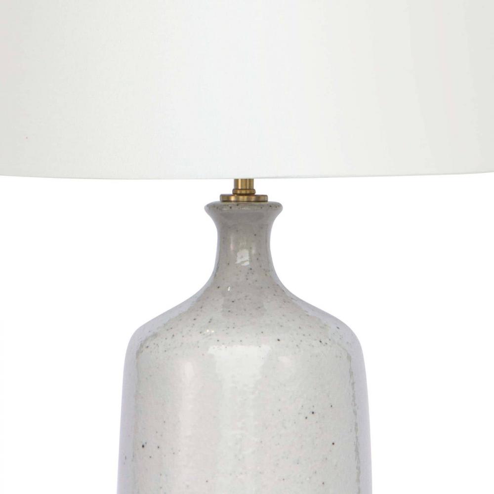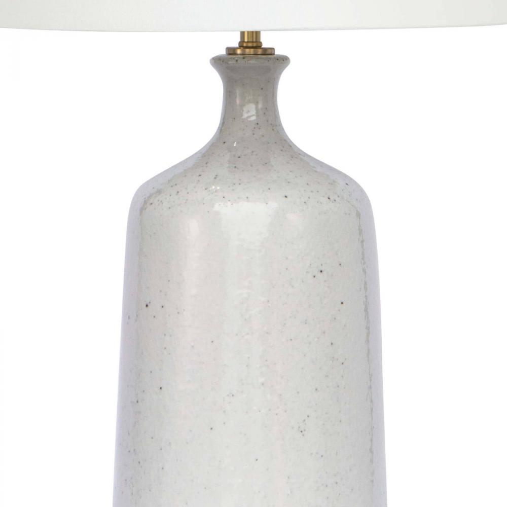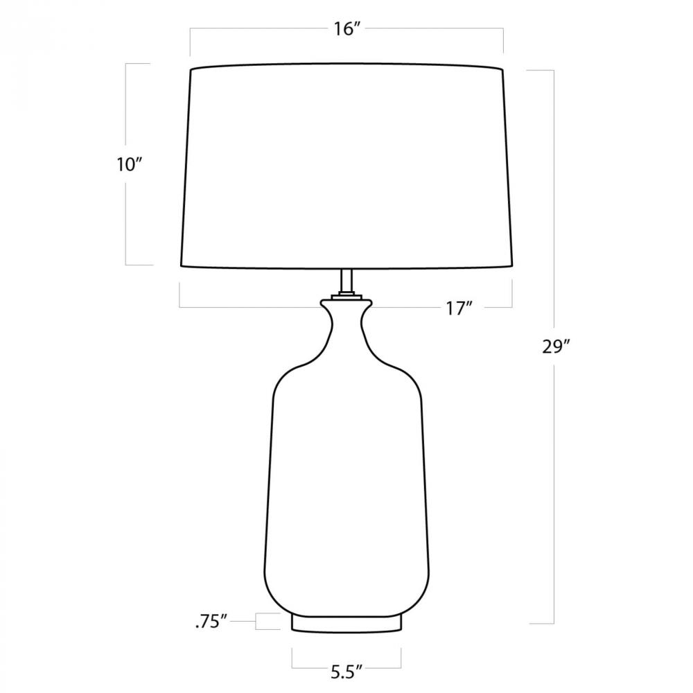 A specialized glazing technique is used to produce the luxurious natural hues of the Glace table lamp. The natural brass finished base serves as an elegant platform for the lamp's dramatic scale. A natural linen shade, shaped and rolled by hand, is topped with a round matching finial.
