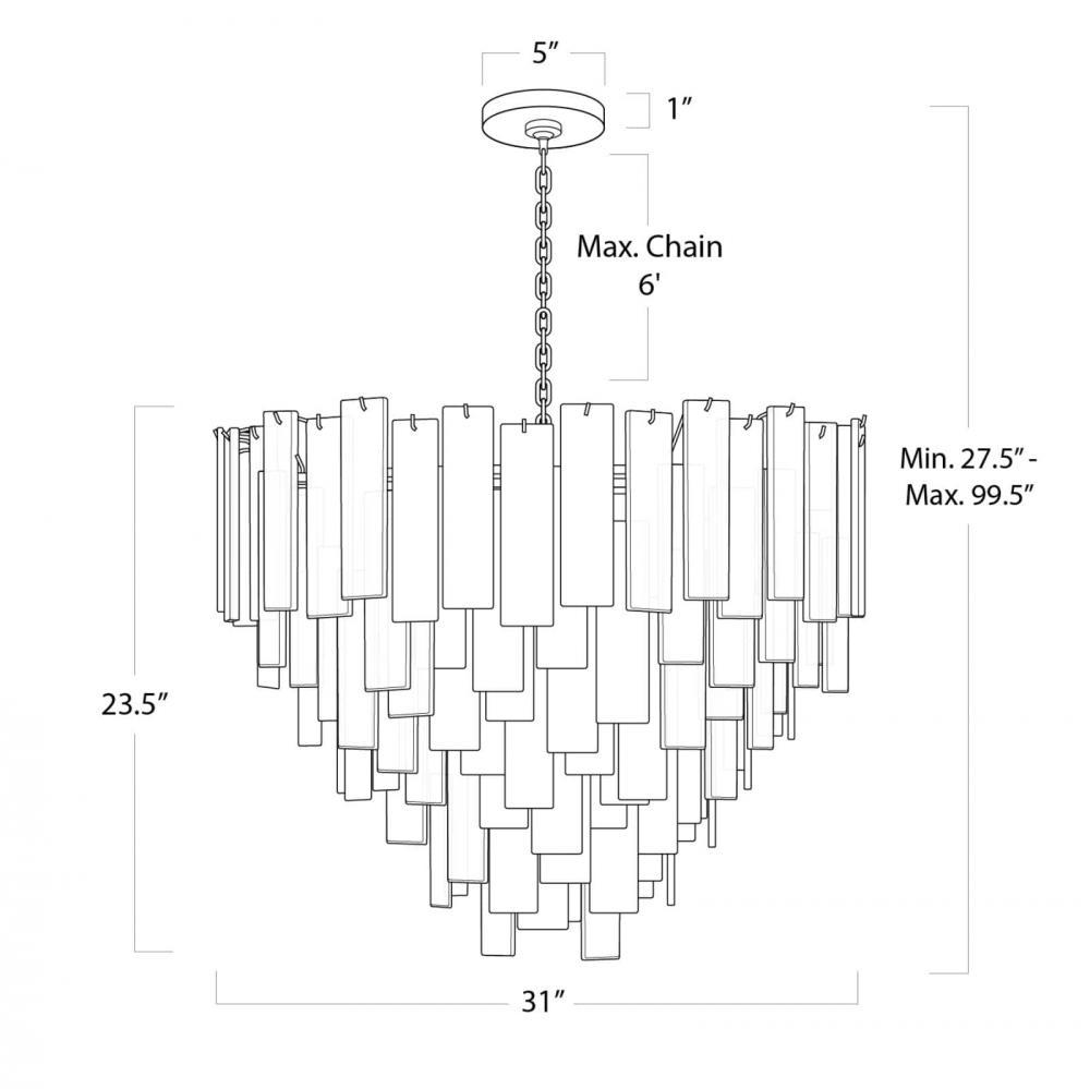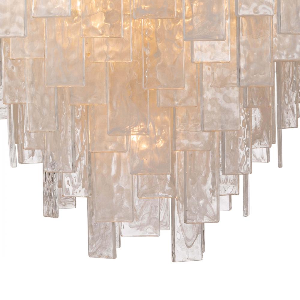 Panes of striking water glass with white swirls adorn the large Glacier chandelier to create a dynamic piece full of movement. The glass diffuses the light, providing a soft glow to the area around it, perfect for a foyer or living room.