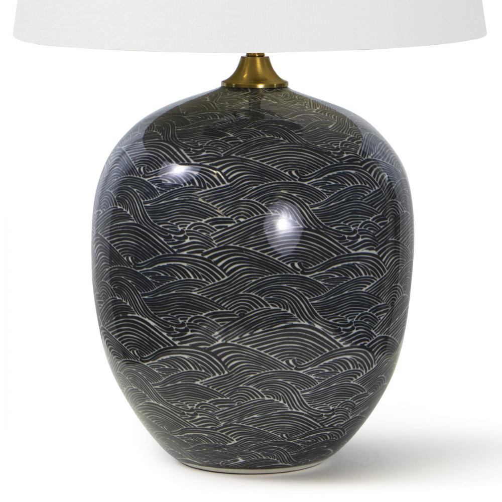 Ride the wave with this Japanese-inspired ceramic black-and-white table lamp. Its crisp natural linen shade and natural brass hardware perfectly accent the delicately detailed artwork. Place this lamp in a living room or bedroom and admire its beauty.