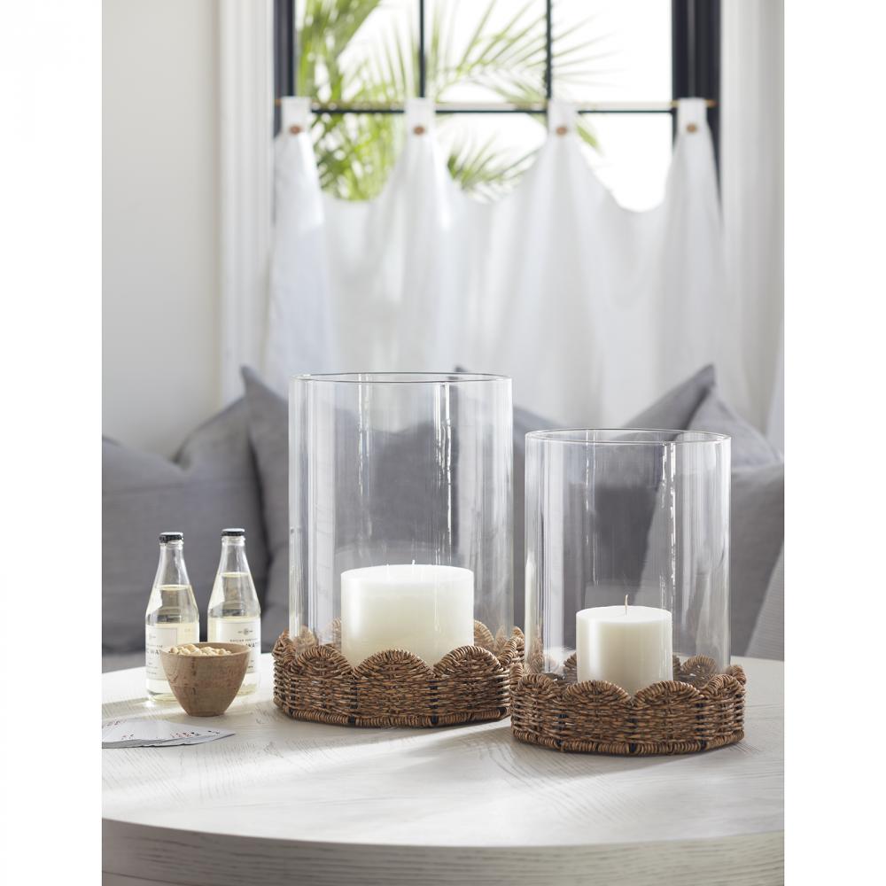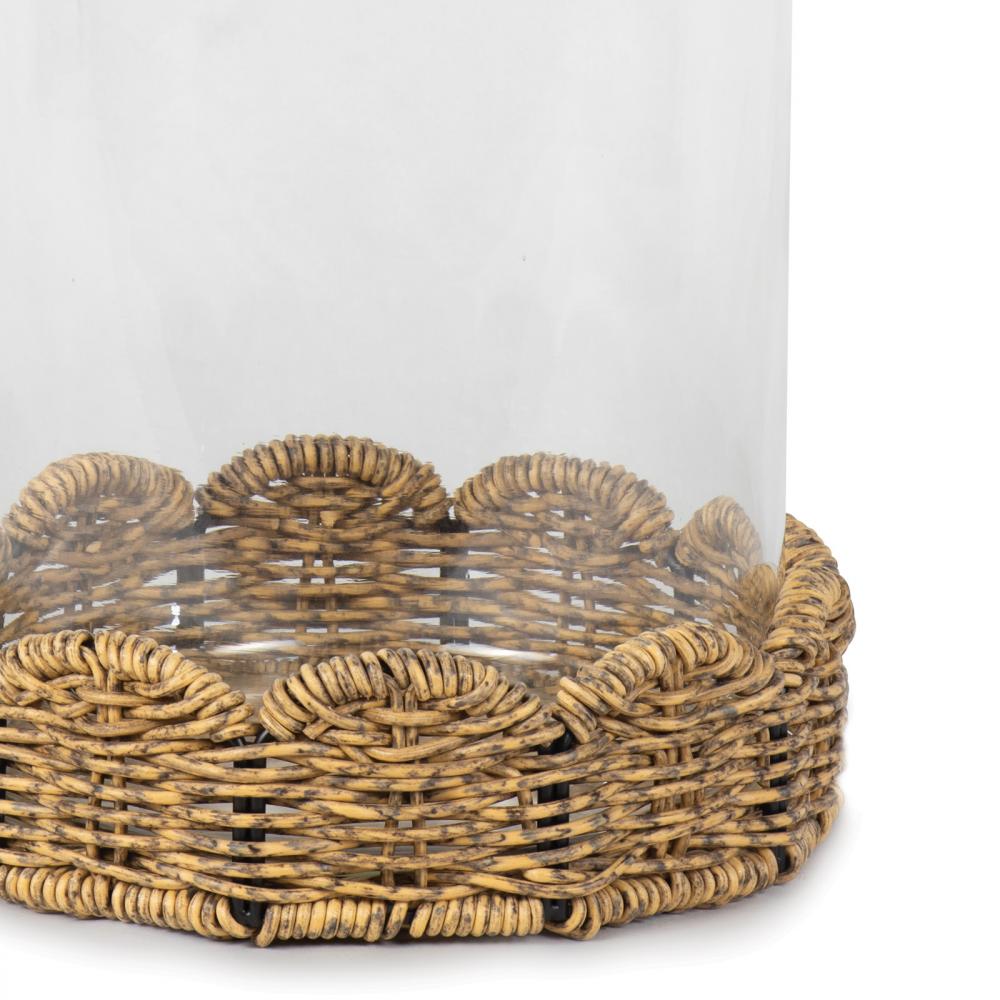 A straight-lined glass cylinder nestled into a scalloped rattan-like base is ready for whatever your home has in store. Let the flickering wick of your favorite candle shine through as you sit back and relax on the patio with friends and family. You can even style your favorite tropical foliage to freshen up your outdoor oasis. This versatile hurricane is made from quality materials that are meant to withstand the elements from season to season.