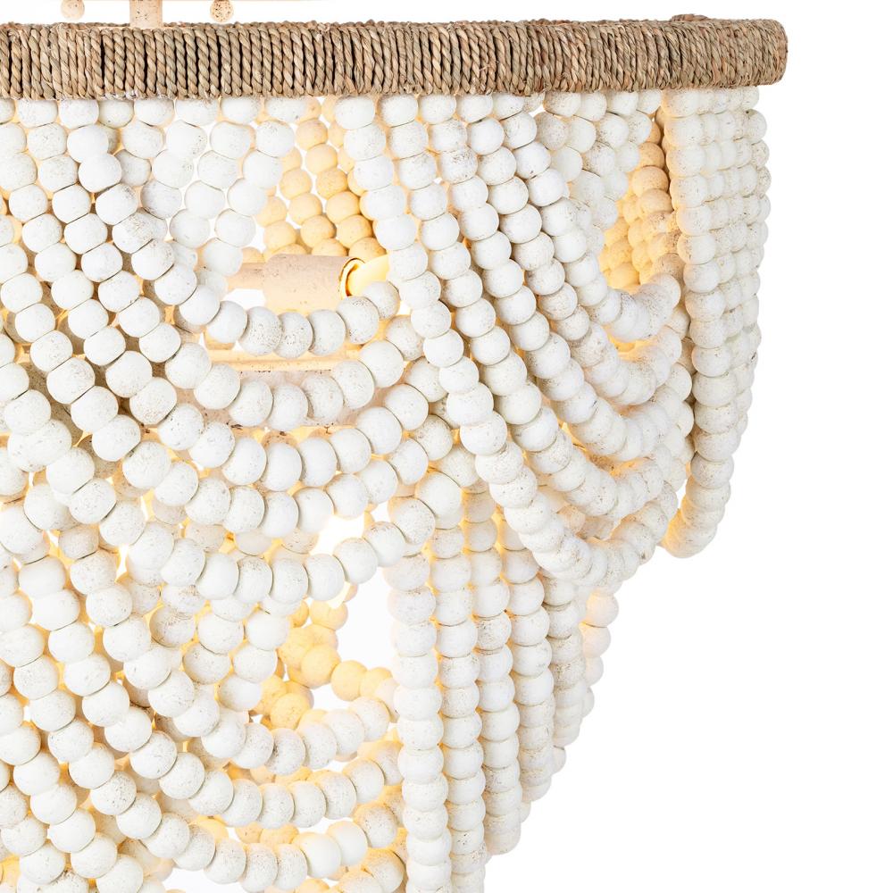 Cascading layers of soft-distressed white wooden beads in the Lorelei provide a graceful display over a jute-wrapped circular frame. The flush mount fixture is both elegant and versatile, equally beautiful in living and dining spaces throughout the home.