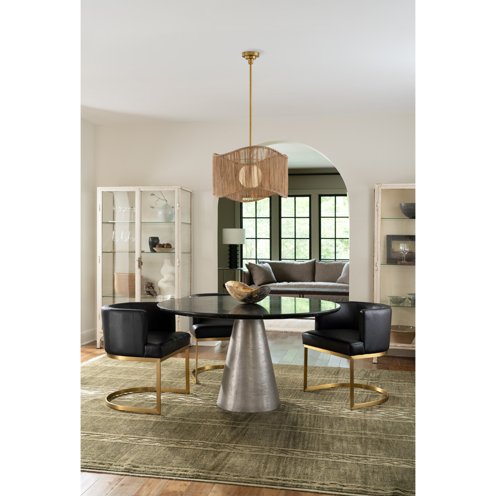 A wide, wavy, woven shade surrounds a white milk glass globe in the Nimes Drum Pendant. Finished in natural brass, the fixture’s braided edge ebbs and flows, casting a warm light with discreet elegance.