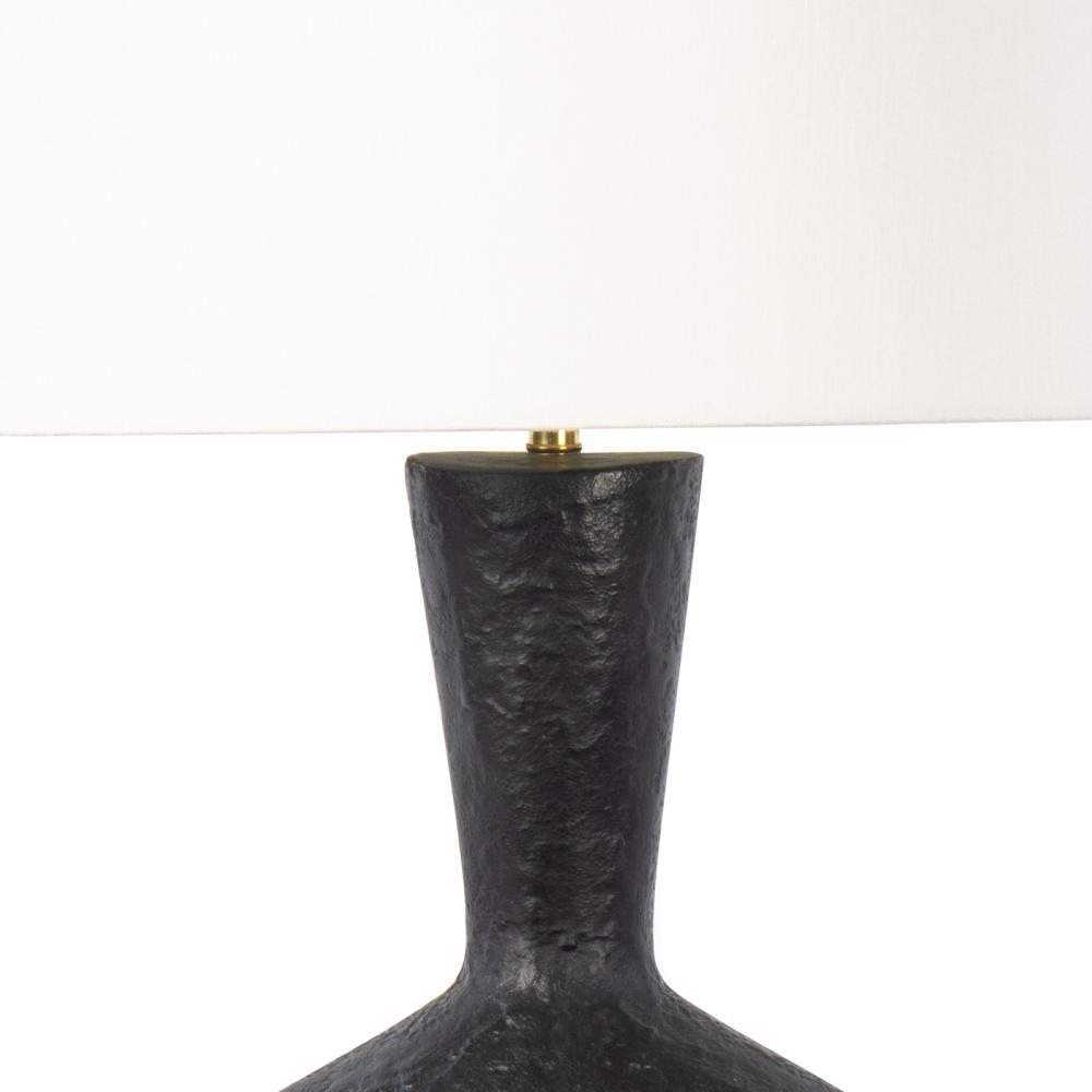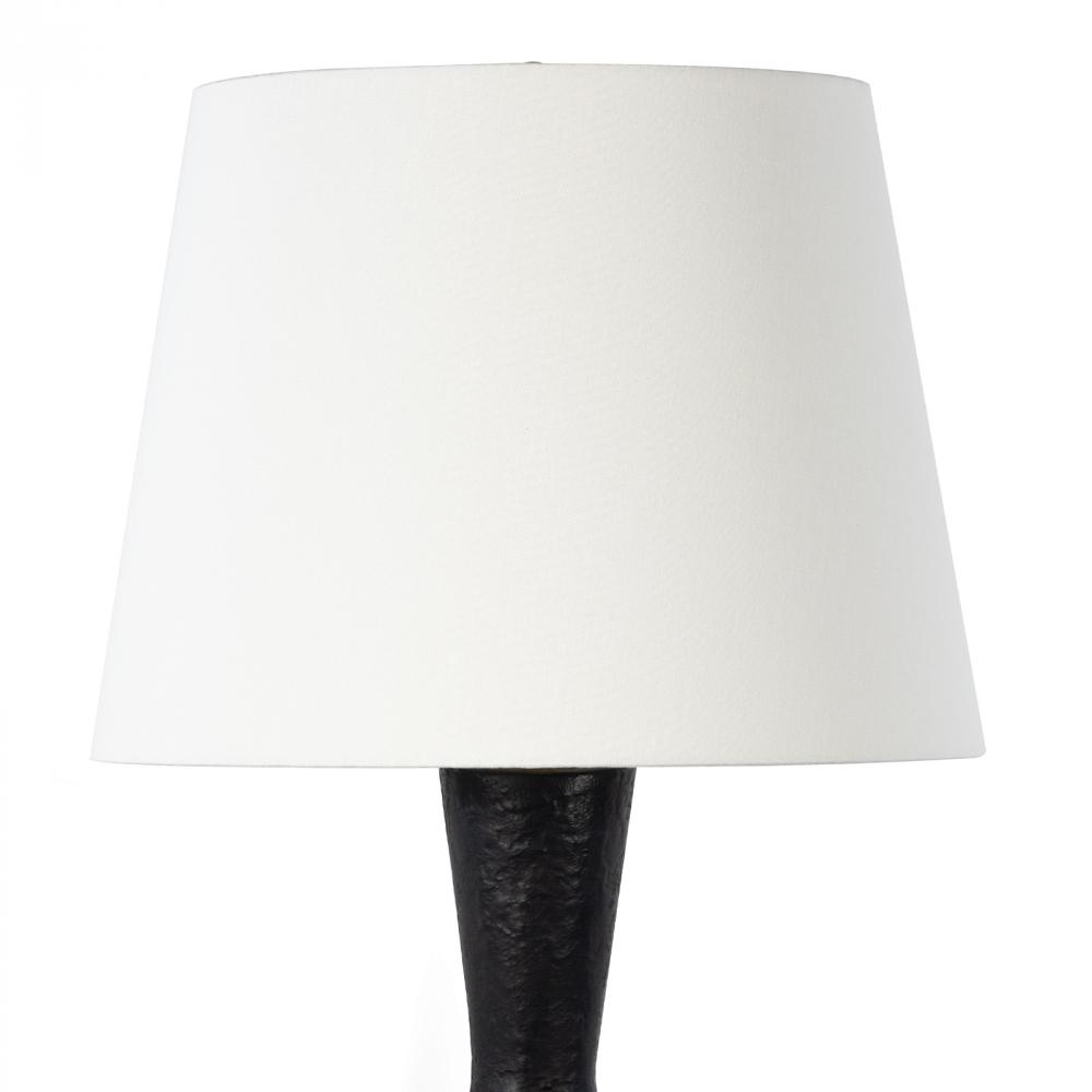 The Poe Metal Table Lamp is a sculptural piece that is destined to be a focal point in your home. The blackened plaster finish on its metal body is mottled with a texture that is crafted to have an artisan, handmade feel. It pairs nicely with its natural brass base and natural linen lampshade.