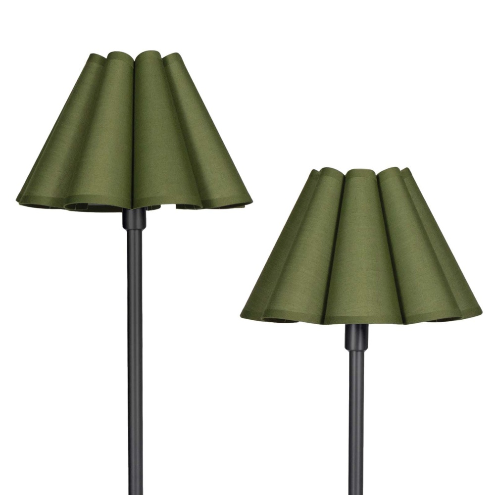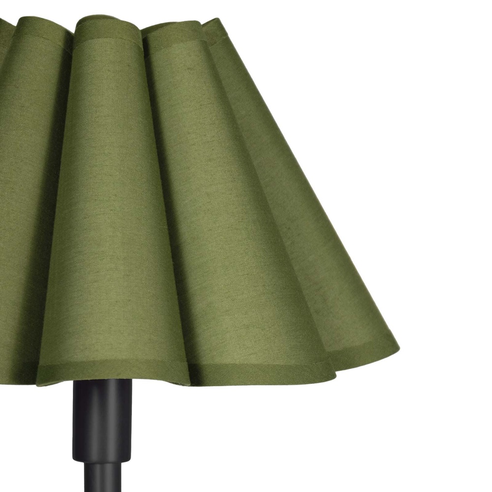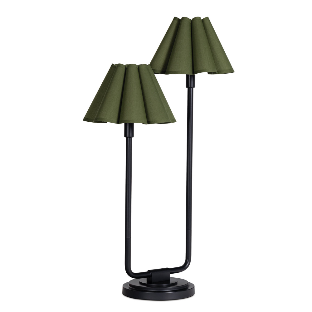 An imaginative twist on a classic style, the Polly Double Arm Table Lamp reaches upward with twin scalloped shades in a rich, verdant hue that provides the perfect glow for reading or meaningful conversation. With varied heights in slim, blackened brass, the lamp strikes a perfect balance between classic and modern to add an airy and unexpected elegance to your space.