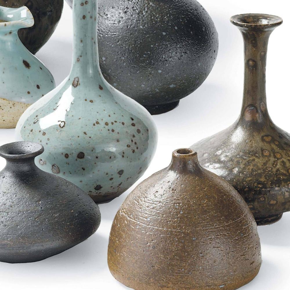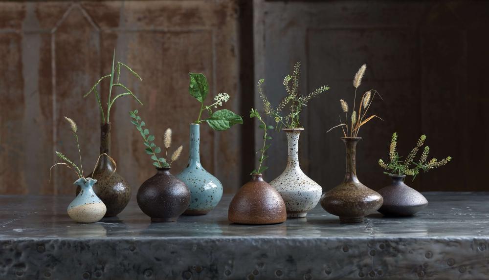 This set of 8 delicate porcelain bud vases makes for an eclectic, handmade look. Varying shapes, sizes, and colors — from robin’s egg blue to warm browns — these vases complement a farmhouse or coastal look well.